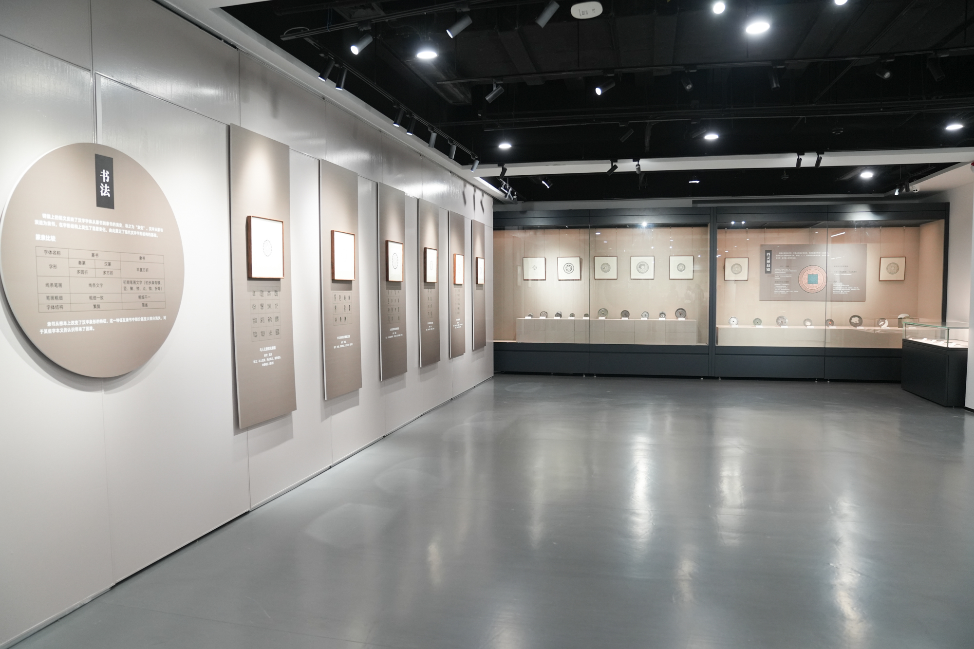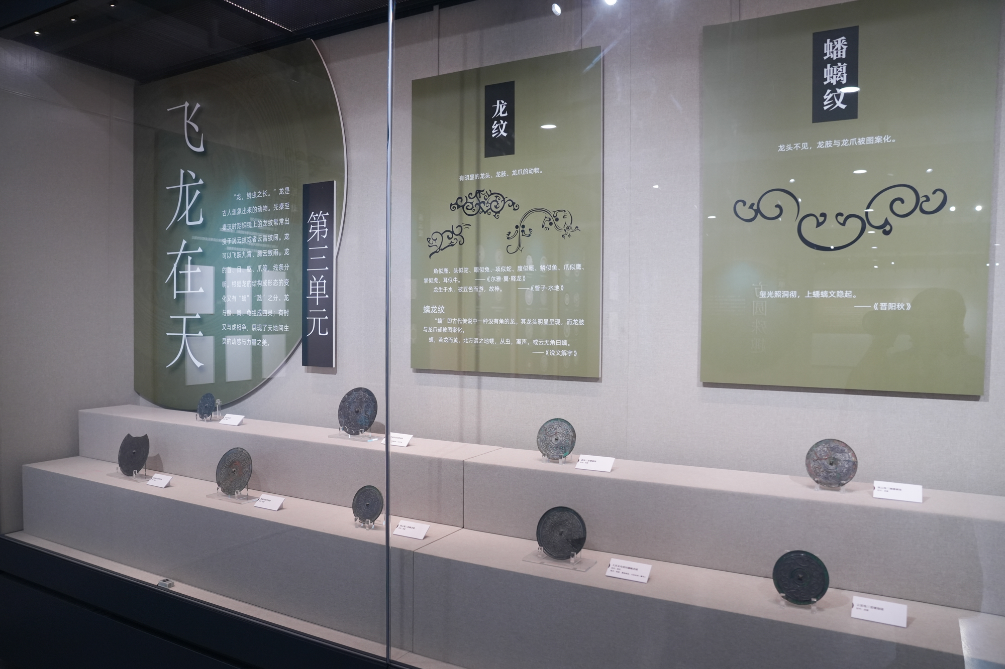 本次展览以“秦汉止水”为主题,分“明镜鉴形”“方圆殊趣”“飞龙在天”和“巧刻文章”四个单元展示先秦至秦汉时期的100面珍贵铜镜。这批铜镜,跨越了春秋战国至东汉中晚期至三国六朝,时间跨度长,类型丰富,涵盖了几何纹、动物纹、铭文等多种纹饰类型。