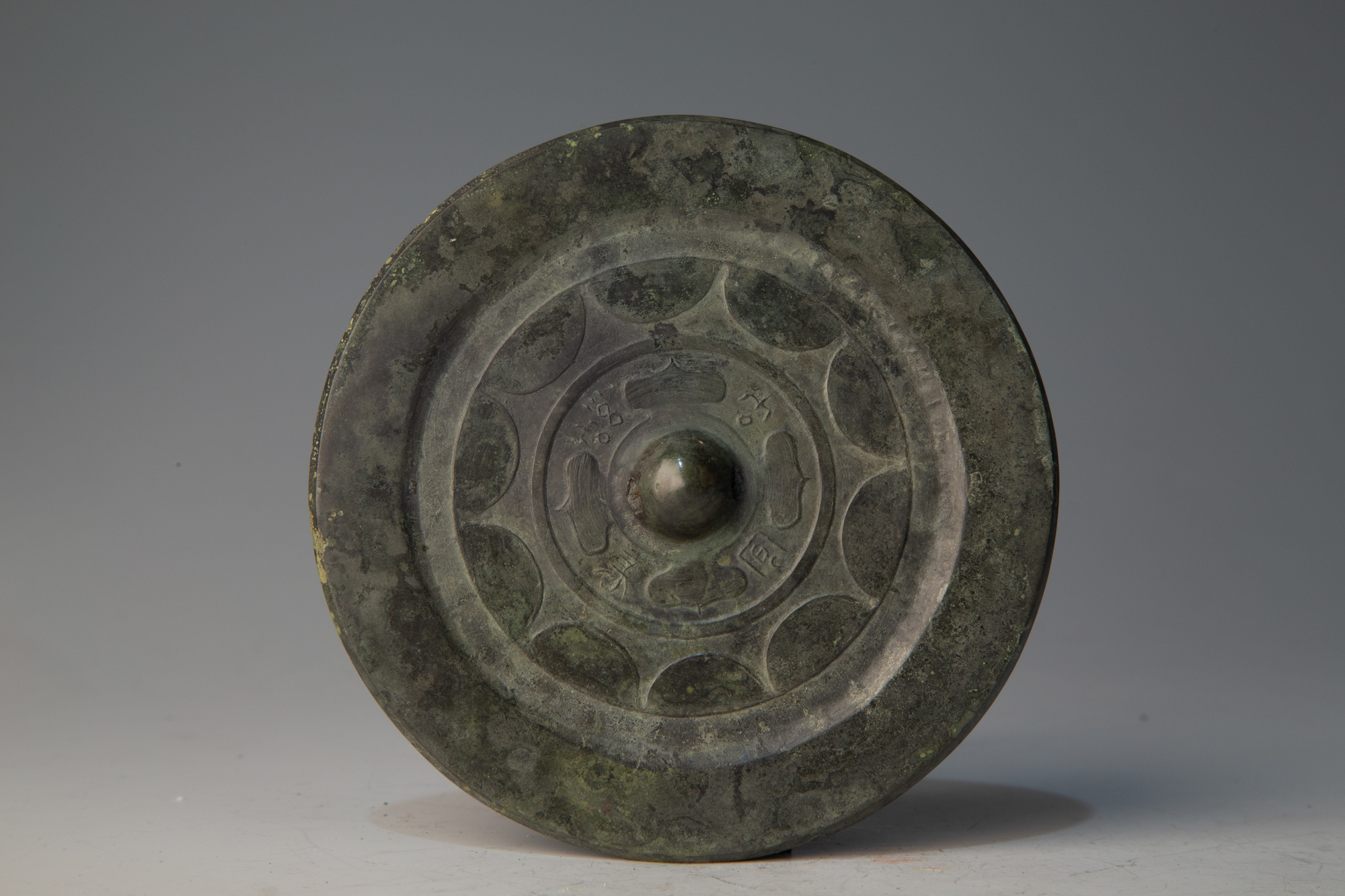 本次展览中的铜镜多为圆形具钮镜,镜钮在铜镜的使用中也发挥着重要的作用,仔细观察展厅里铜镜的镜钮造型也各不相同。