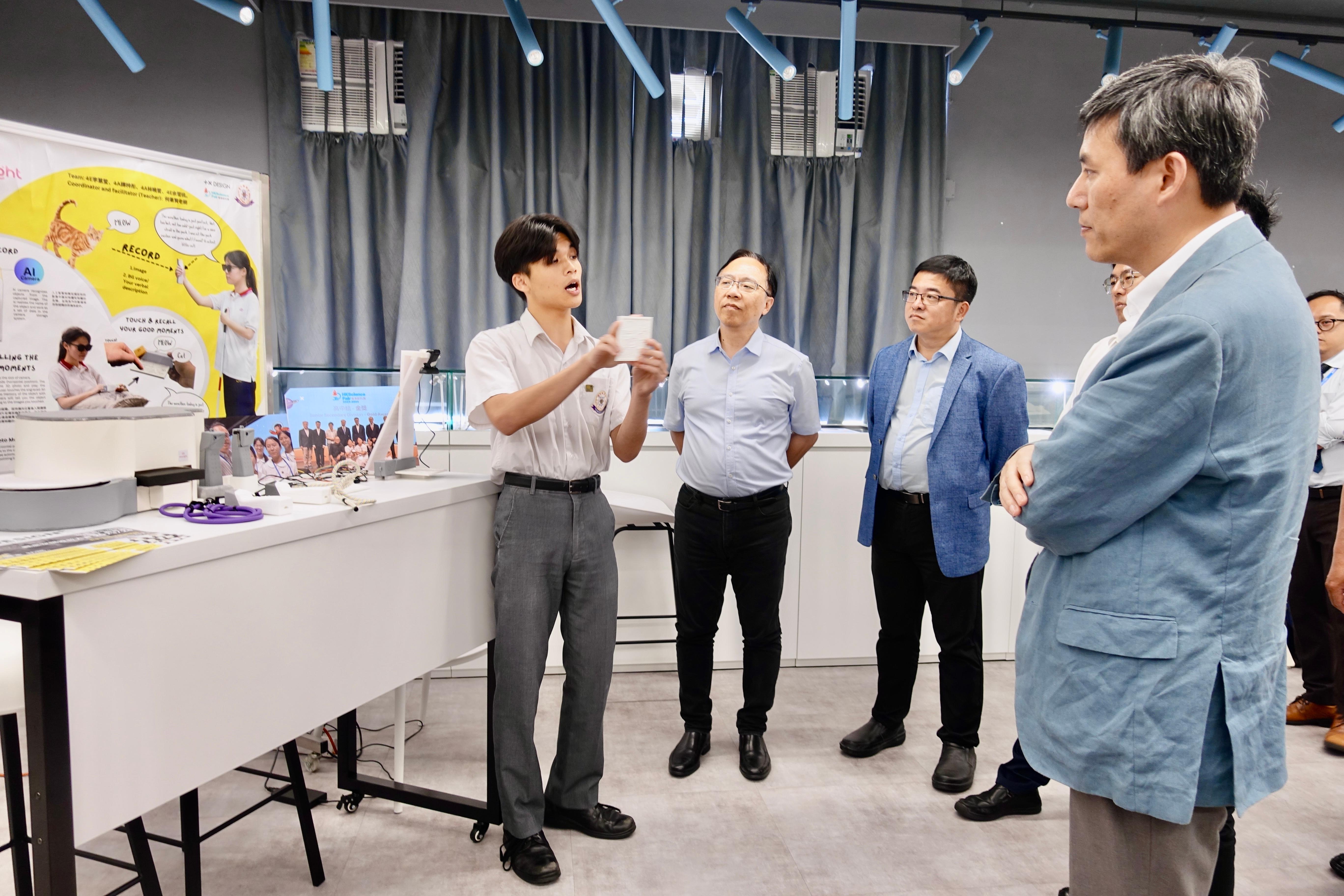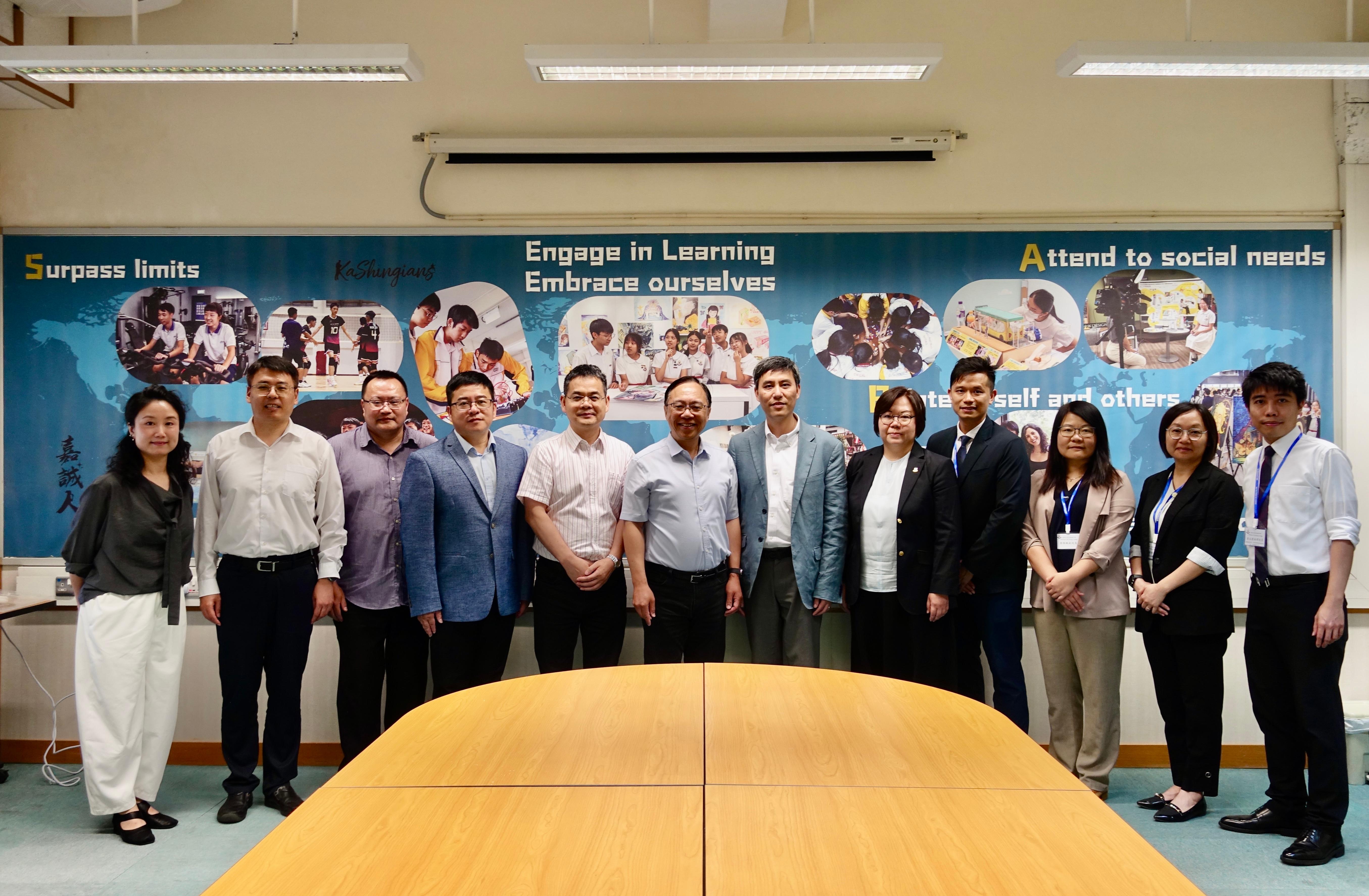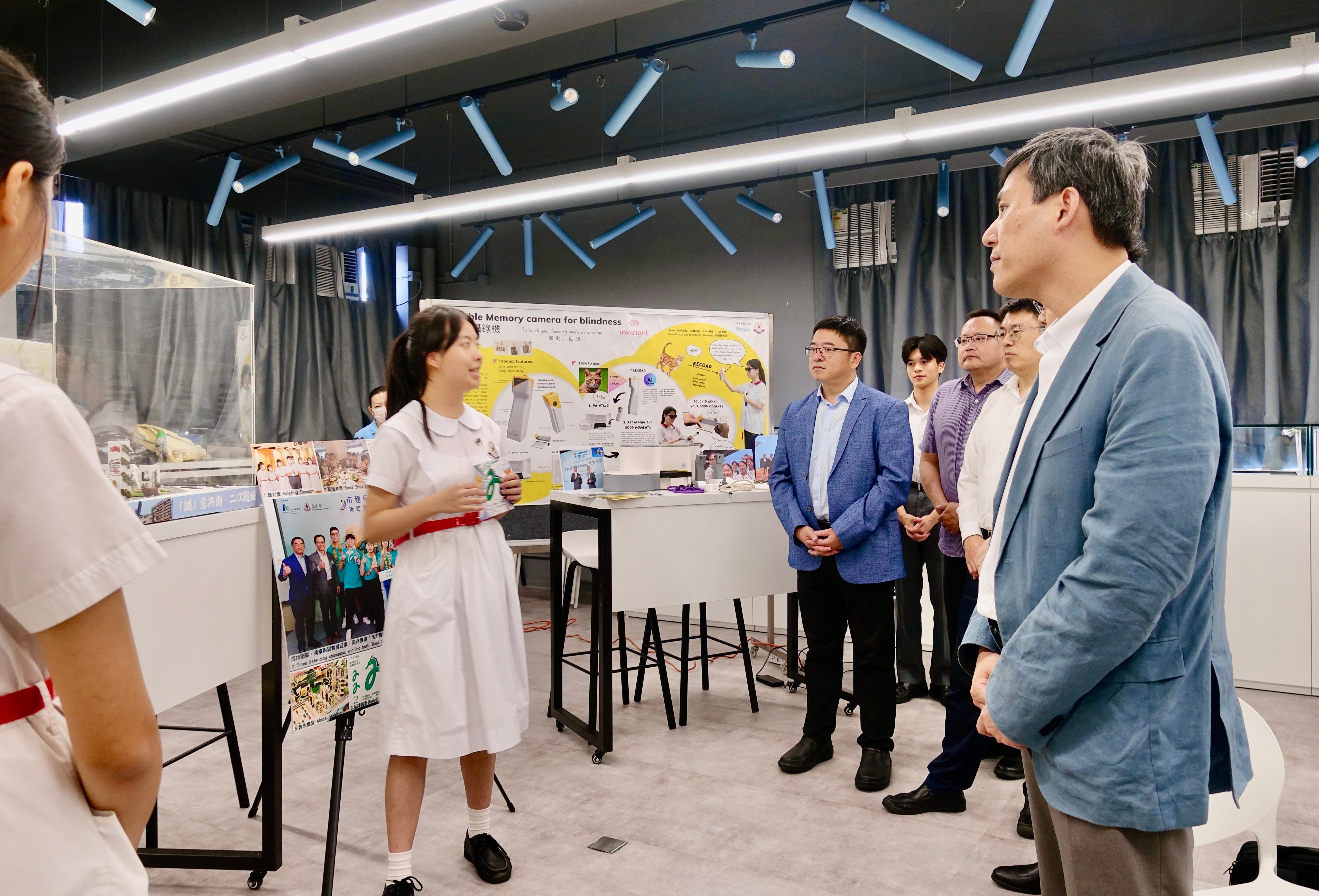 代表团教育专家与东华三院历史、地理科青年教师就“AI与历史和地理教学”“教师成长和职后培训”等主题开展交流。代表团面向甲寅年总理中学、李嘉诚中学两校学生开展招生宣讲,还听取了两校中学生讲解的创科项目,并参观了学校STEAM教育设施。