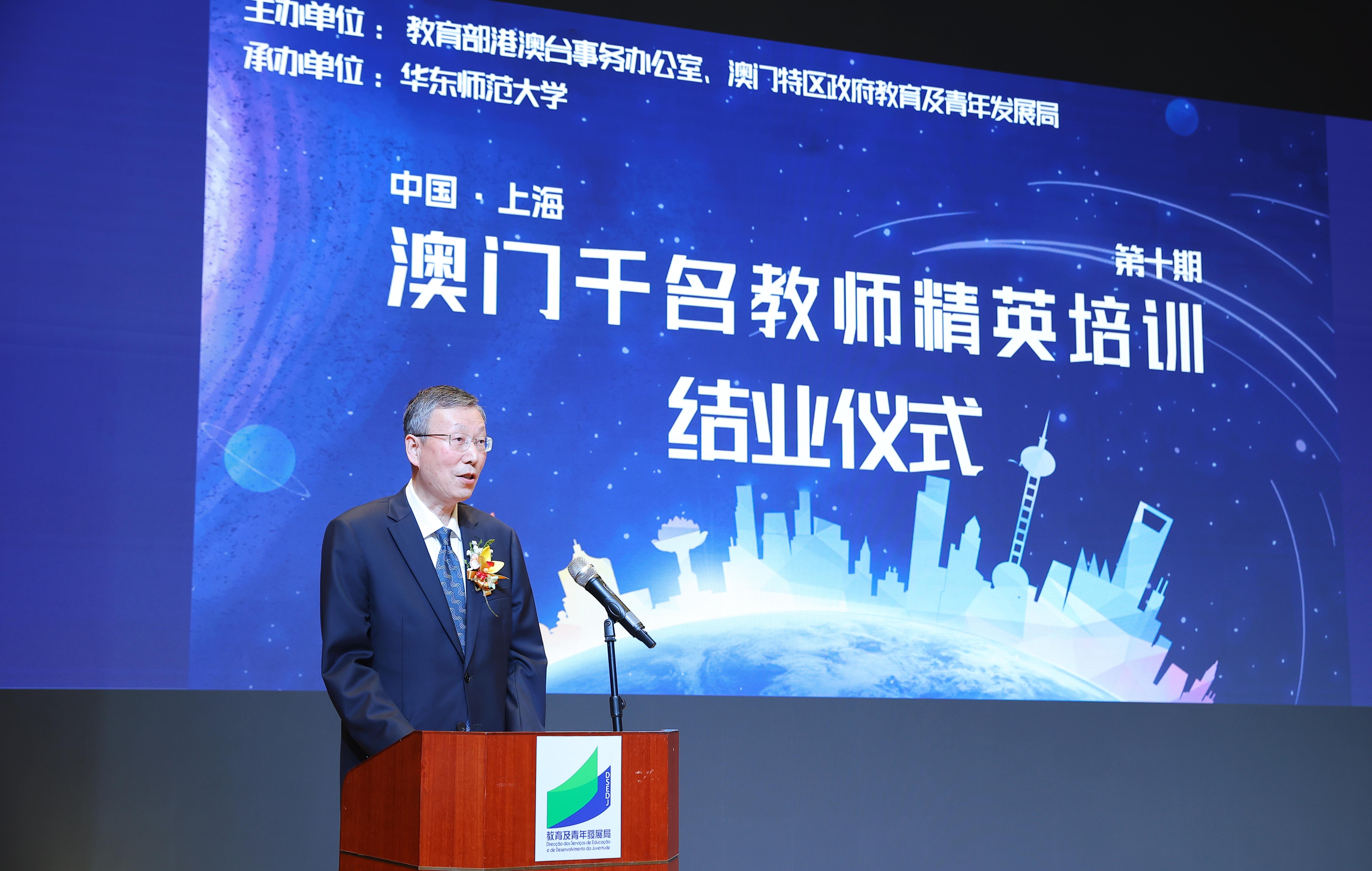 在“澳门千名教师精英培训计划”第10期结业仪式上,王嘉毅副部长指出,教育部将继续加大对澳门教师培训的支持力度,为澳门教师提供更多的学习机会和发展平台,并提出了持之以恒、守正创新、学以致用三点希望,以期进一步做好澳门教师培训工作,努力谱写教育强国建设的新篇章。孟钟捷在致辞中表示,华东师大将继续发挥学科优势,服务国家教育发展大局,促进澳门教育发展和文化繁荣,未来将探索更多元化、更高质量的教师培训模式,为澳门教育事业的发展贡献力量。