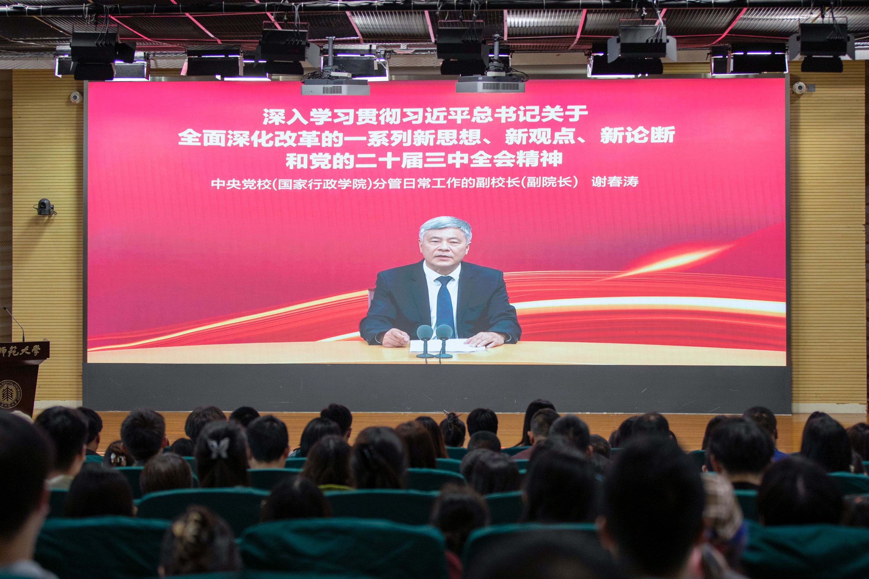 中央党校(国家行政学院)分管日常工作的副校长(副院长)谢春涛作《深入学习贯彻习近平总书记关于全面深化改革的一系列新思想、新观点、新论断和党的二十届三中全会精神》主题报告
