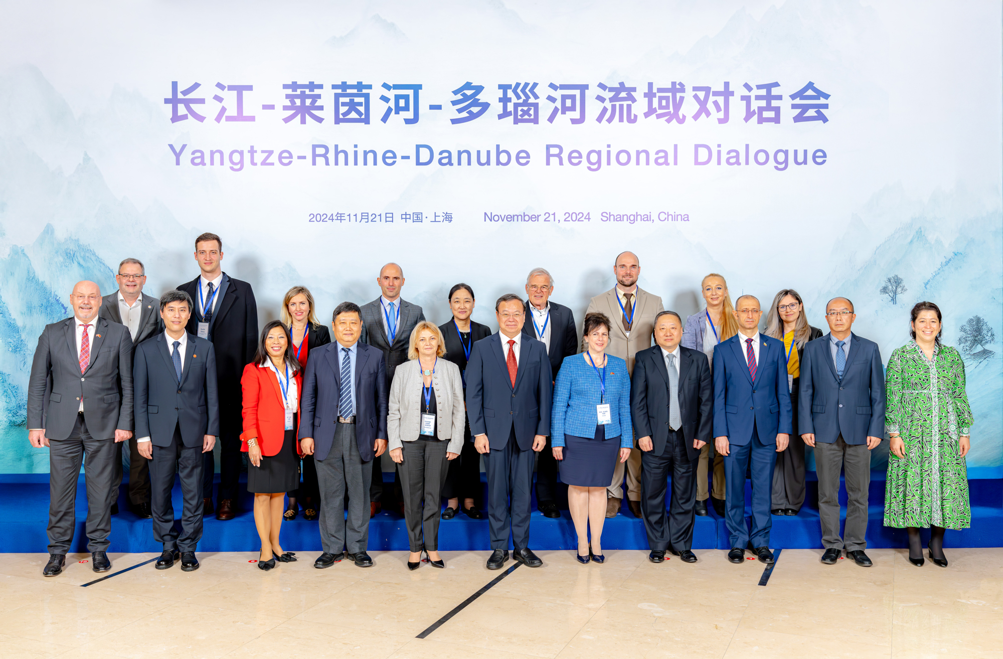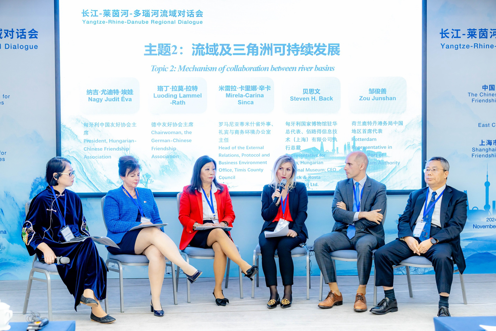 匈中友协主席纳吉·尤迪特·埃娃,德中友好协会主席珞丁·拉莫-拉特,保加利亚驻上海总领事斯帕索夫,斯洛伐克驻上海总领事伊戈尔·帕佐拉克,荷兰驻上海副总领事康如幸,匈牙利驻上海总领馆文化领事洋风,以及莱茵河和多瑙河相关国家的专家学者与会。全球大河三角洲地区高校代表,四川省、安徽省等长江流域的省市代表,以及中欧科研院所专家学者、商会、机构和企业等代表参会。