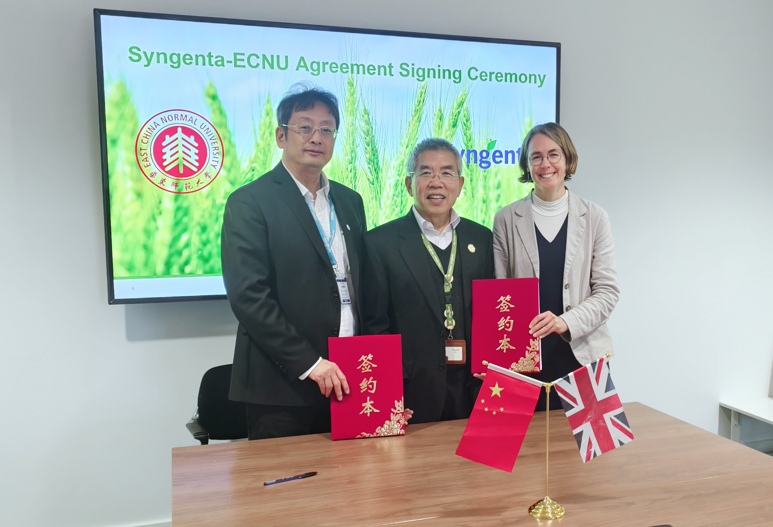 在访问英国先正达集能山(Jealott's Hill)国际研究中心期间,施国跃与先正达首席技术专家兼国际合作项目总监顾玉诚、技术收购与合作事务主管Helen Chapman共同签署双方合作协议。会谈间,施国跃简要回顾双方合作项目的主要进展,重点介绍了华东师大在推进化学大模型方面取得的突出成果,表示愿同先正达在研究领域中互学互鉴,共同探索更多元的合作内容。