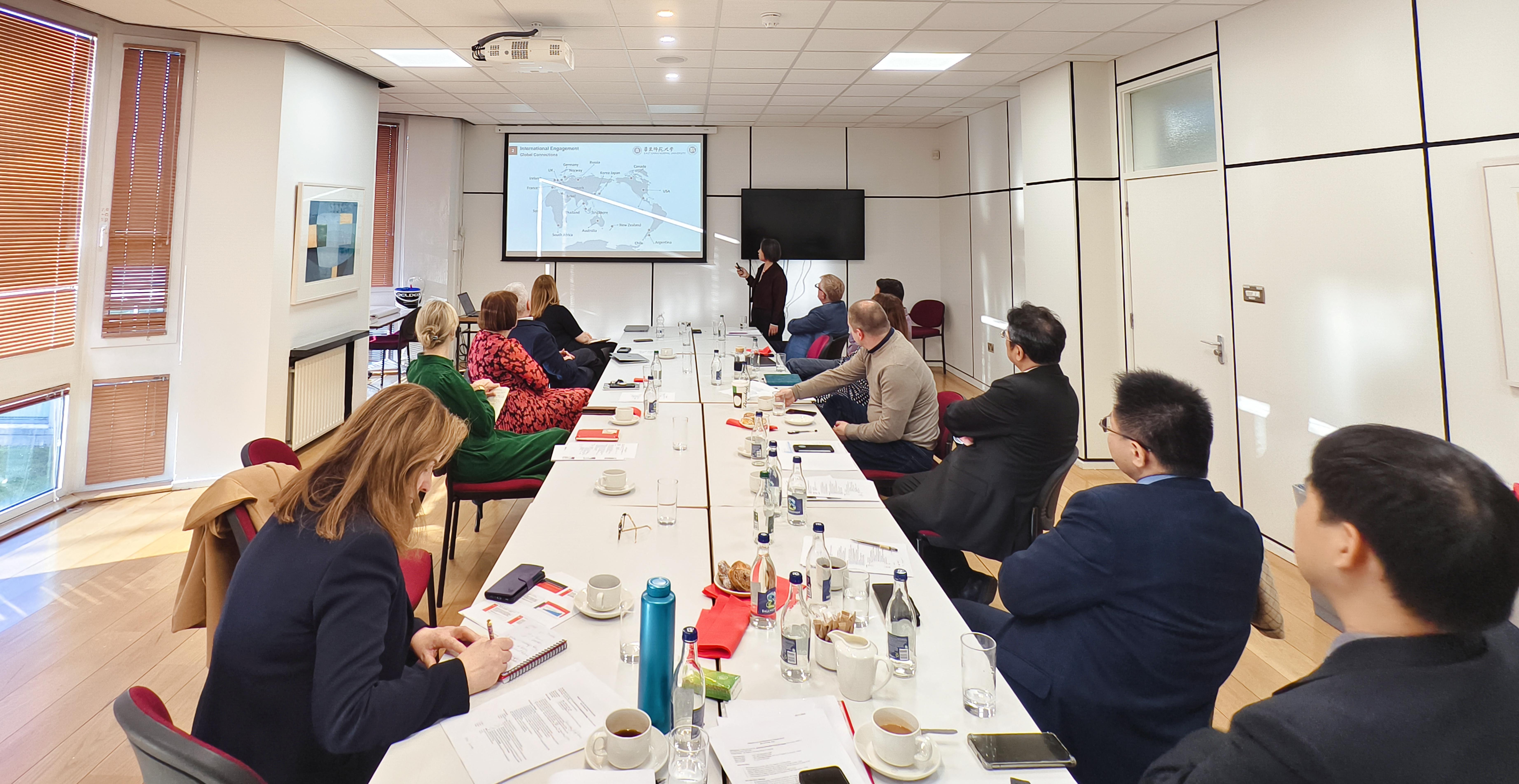访问期间,代表团认真听取都柏林城市大学STEM教学提升中心主任Cliona Murphy、教师教育合作研究中心联合主任Catherine Furlong和Sabrina Fitzsimons、广纳包容性教学中心主任Joseph Travers、学前教育研究中心代表Grainne McKenna围绕教育研究实践的专题报告。华东师大教育学部高等教育研究所教授李梅介绍了学校教育学科的相关情况。研讨期间,双方就智慧教育、广纳包容性教育、博士研究生访问研修计划等潜在合作内容深入交换了意见。