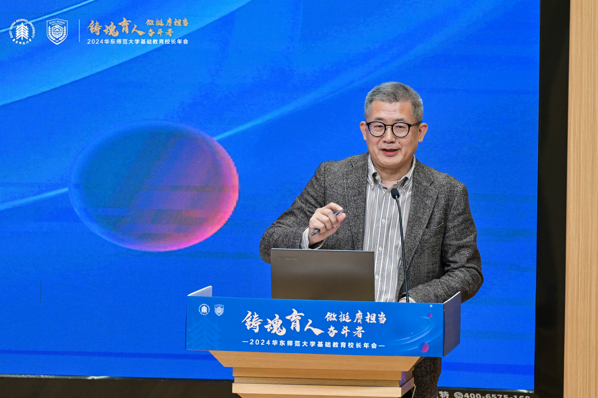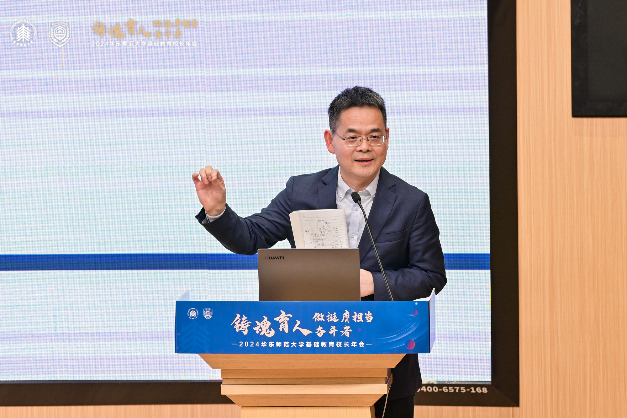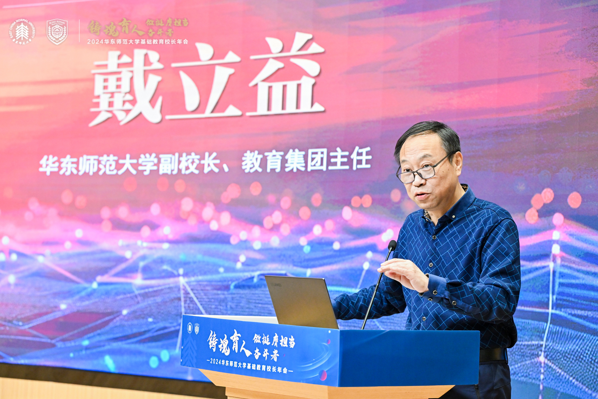 永利皇宫登录官网副校长、教育集团主任戴立益表在讲话中,全面回顾总结了2024年永利皇宫登录官网教育集团校的办学成绩,并对年会主题进行了解读。他建议校园长注重培养日常行政管理能力、课程领导力和学校迭代发展路径的选择能力;着重阐释了新时代“大先生”之大,在于历史跟未来的大维度、本土和世界的大格局、教室和社会的大课堂、循规和突破的大智慧、小我和大我的大情怀;描述了华师教育人的群像:卓越的霸气和睿智的灵气、开放的张力和包容的定力,及“好学近乎知,力行近乎仁”的品质;并期待未来可以看到集团校在拔尖创新人才培养、AI赋能教育发展、教育评价改革、学生健康成长方面的探索案例。
