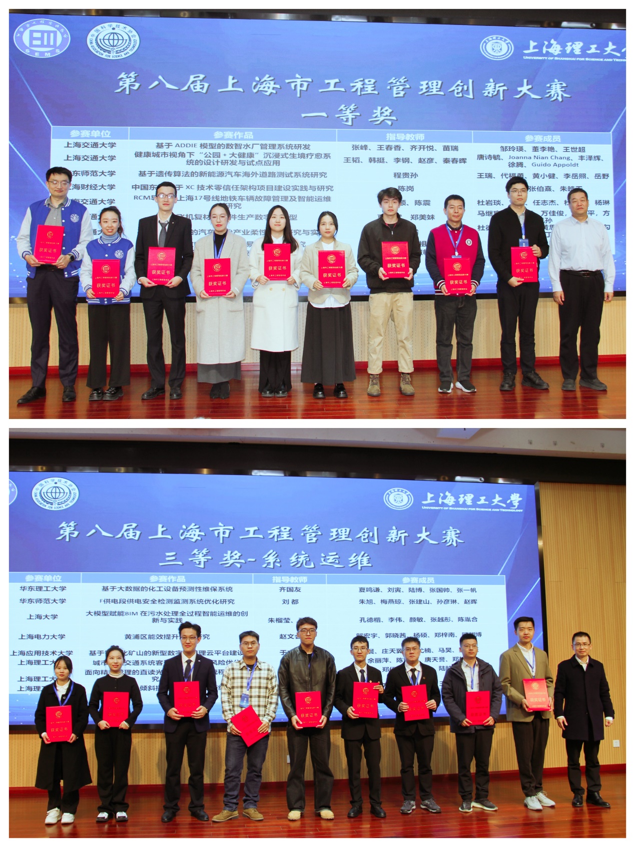 11月30日,第八届上海市工程管理创新大赛在上海理工大学圆满落下帷幕。本次大赛由上海市工程管理学会举办,上海市科学技术协会提供指导,来自上海交通大学、永利皇宫登录官网、同济大学、华东理工大学、上海大学等众多知名高校共67支队伍在决赛中展开了激烈的角逐。经过专家评审团的严格评选,华东师大上海国际首席技术官学院工程管理硕士(MEM)学生团队脱颖而出,取得了令人瞩目的成绩,连续两届在大赛中斩获一等奖等奖项。