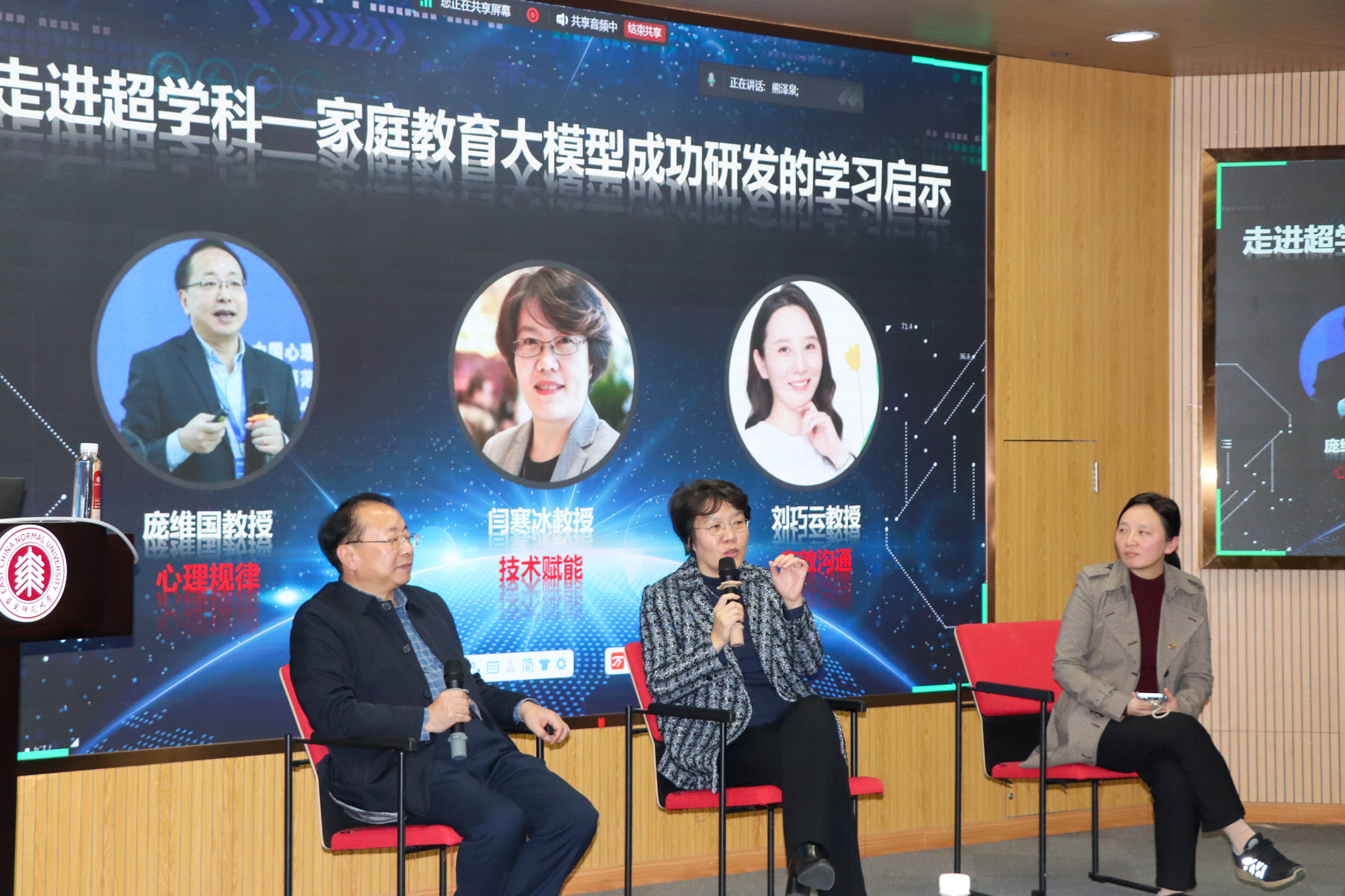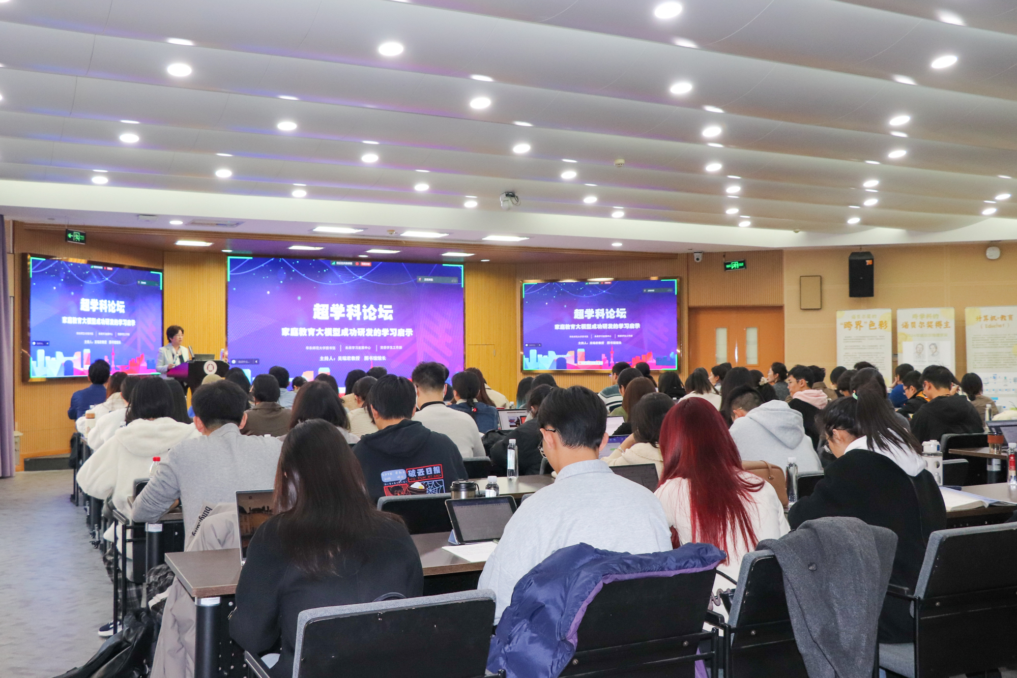 论坛互动环节,三位专家与广大学生面对面,就家庭教育中如何关注家长自身成长、如何平衡专业学习与超学科研究的关系、大模型如何为一线教育工作者提供更多指导、如何以跨学科思维视野开展学习研究等问题进行了交流,提问、答疑,分享、点评,现场氛围积极而热烈。