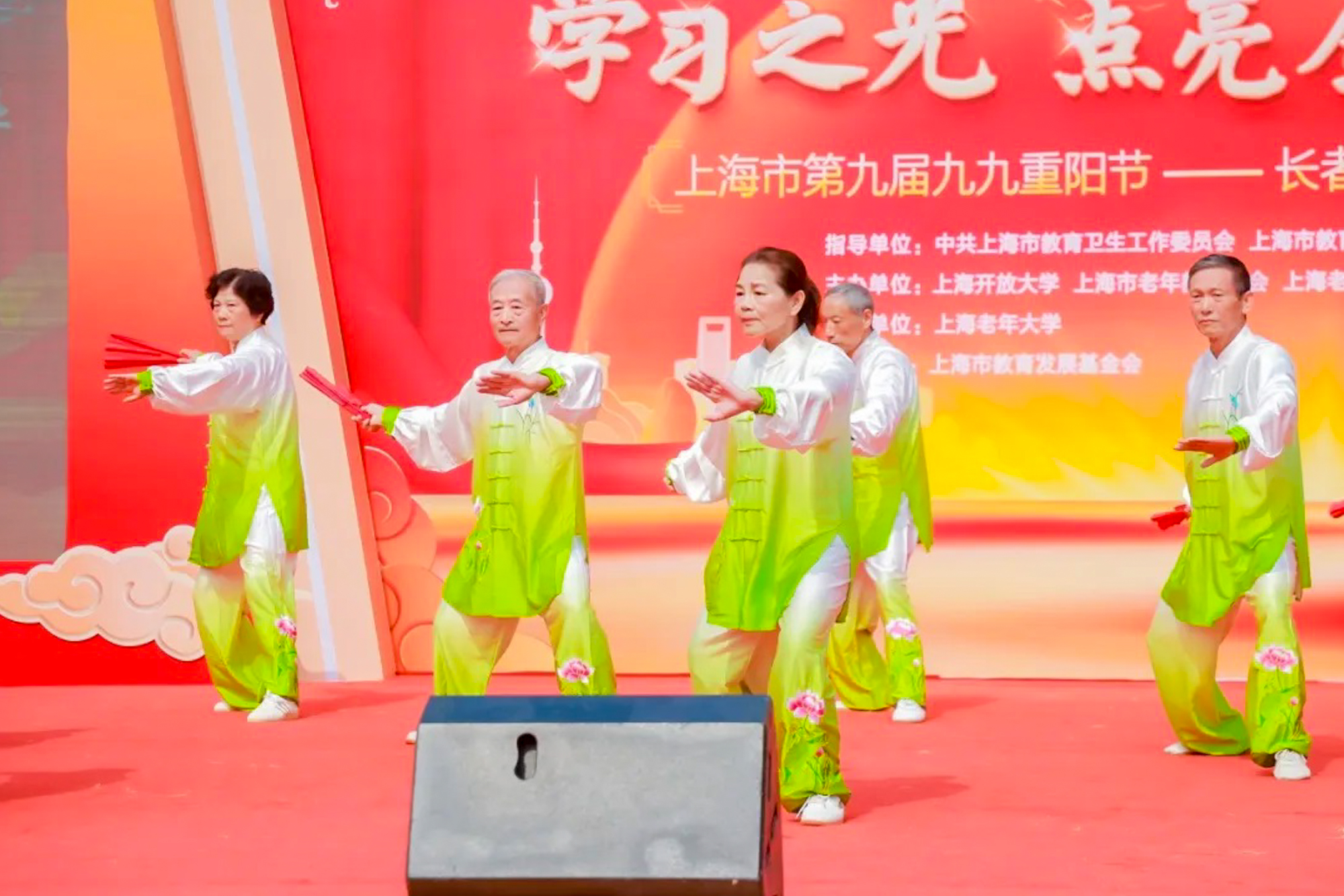 10月10日,学校老年大学派出学员参加上海市第九届九九重阳节“长者风范 天伦之乐”系列活动,十多位学员身着白绿相间的太极服,手持红色太极扇,伴随着歌曲《陈式太极拳扇串烧》雄壮有力的音乐节奏,礼致观众,飘然起舞。学员们的演出展示了中华武术的强大魅力,彰显了中华文化的东方神韵。音画舞交融互补,相得益彰,把和平公园的现场氛围推向了高潮。