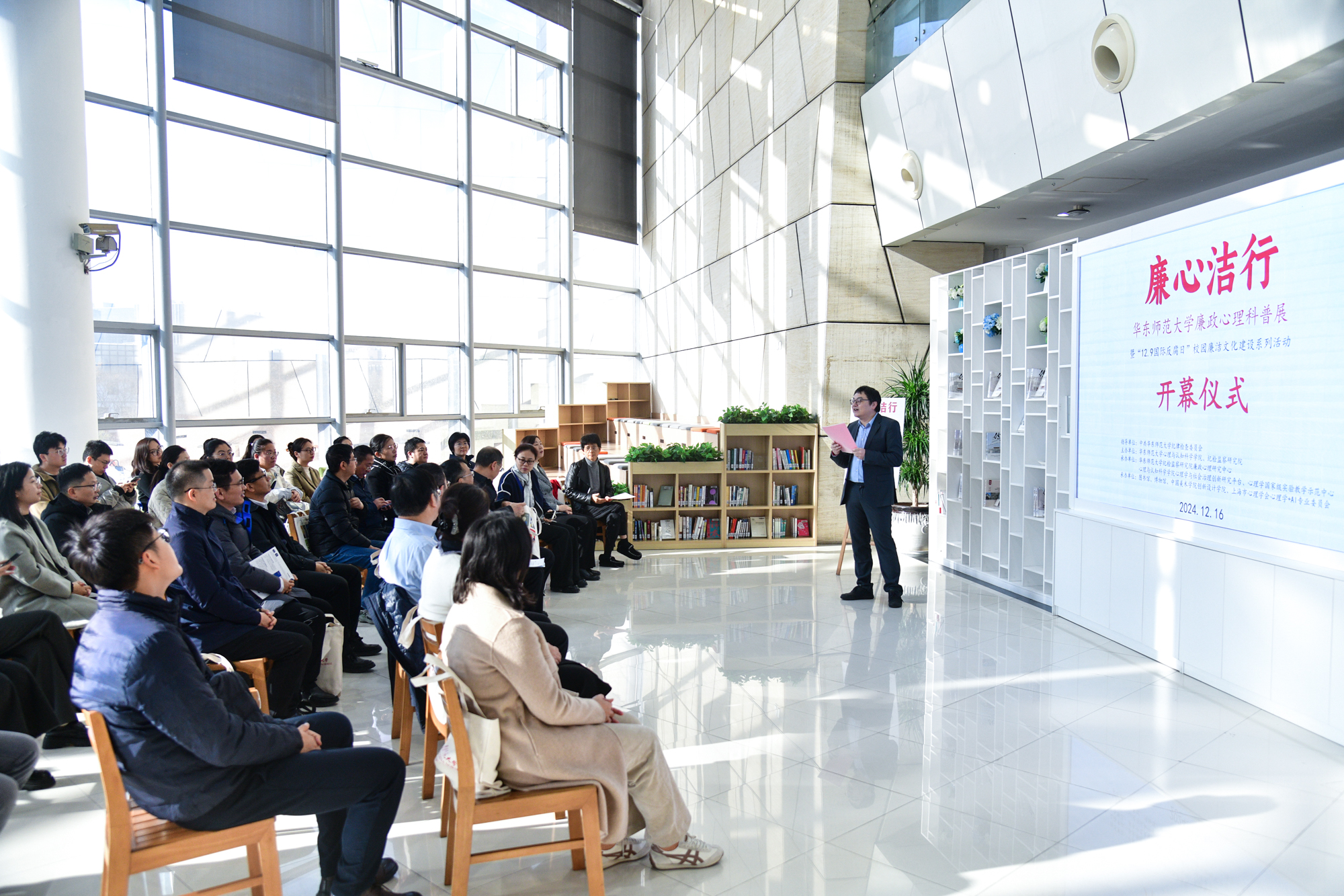 校纪委副书记、监察处处长俞黎阳,心理与认知科学学院党委书记方媛,美术学院党委书记卢蓓蓉,校党委巡察工作办公室副主任郦妍,校博物馆常务副馆长夏祥伟,校图书馆副馆长魏明扬,学校纪委办公室、部分院系兼职纪检员及学生党员代表等参加活动。开幕式由心理与认知科学学院副教授、纪检监察研究院廉政心理研究中心副主任胡杨主持。