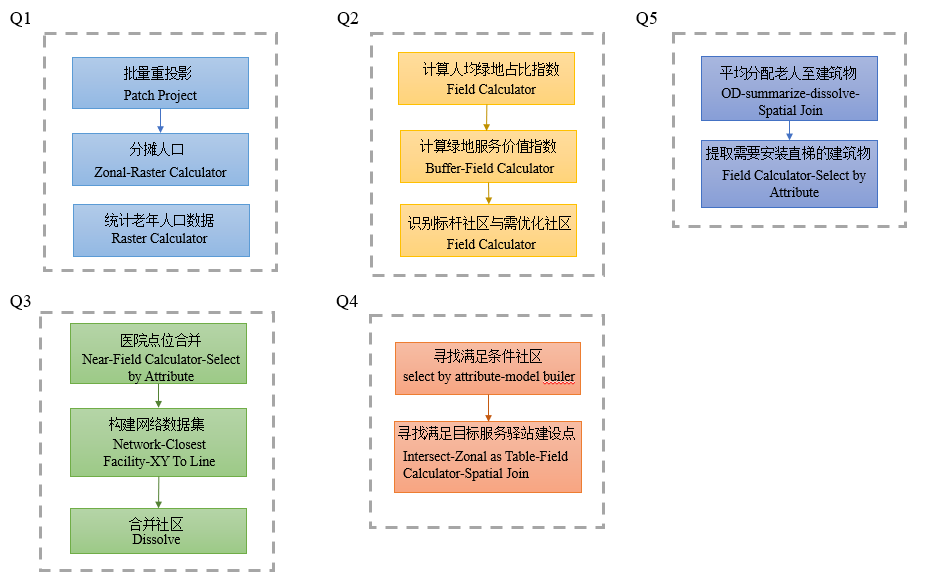 此外,团队还围绕某城市老年人口的空间分布,对服务设施进行了深入分析与优化。在任务实施中,队员们通过数据整合入库、空间邻近度分析、网络分析、优化分析等手段,分步骤完成了任务拆解,并识别出需改造的适老住宅楼,同时借助可视化工具进行结果展示。下图展示了该题的解题思路与最终结果。