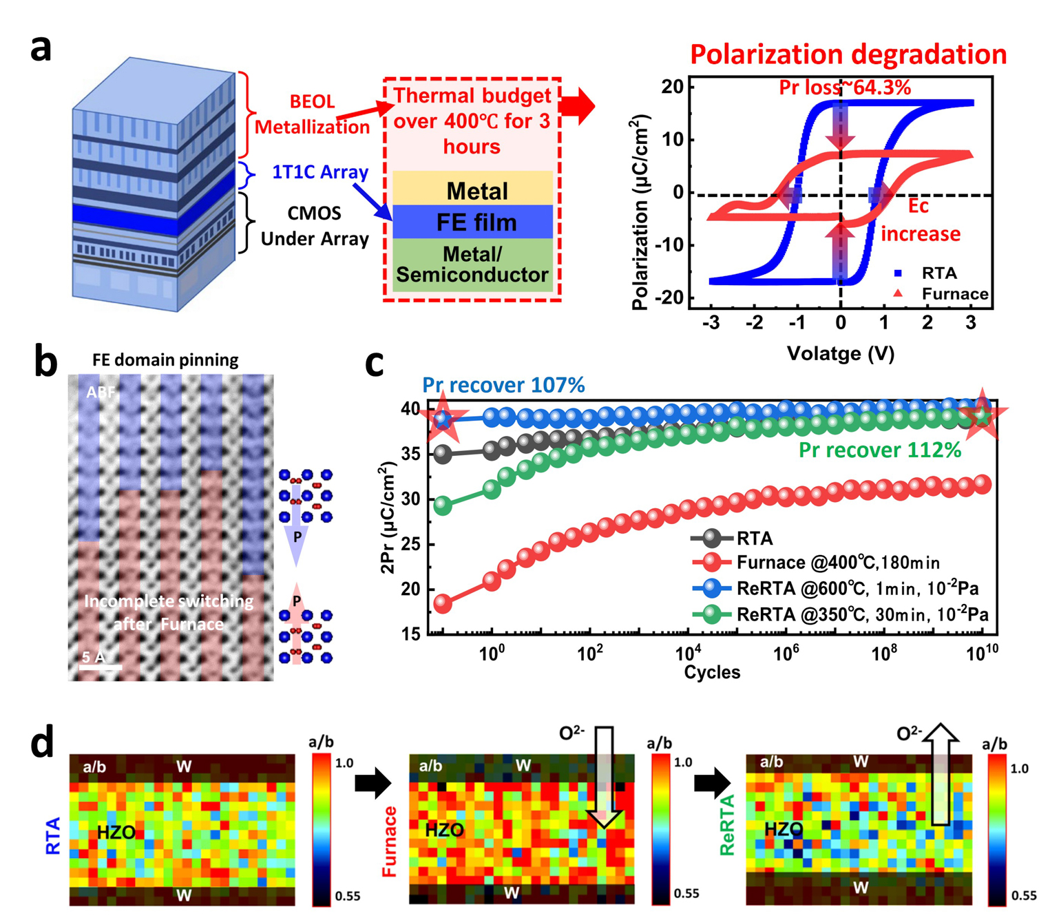 (a)后端工艺热预算导致铁电单元极性退化,(b)器件性能退化源自热工艺过程中氧离子注入钉扎形成“头对头“180度铁电畴壁,(c)超高真空低温退火工艺帮助器件性能恢复,(d)提出了氧离子迁移引起的极性退化与恢复机制