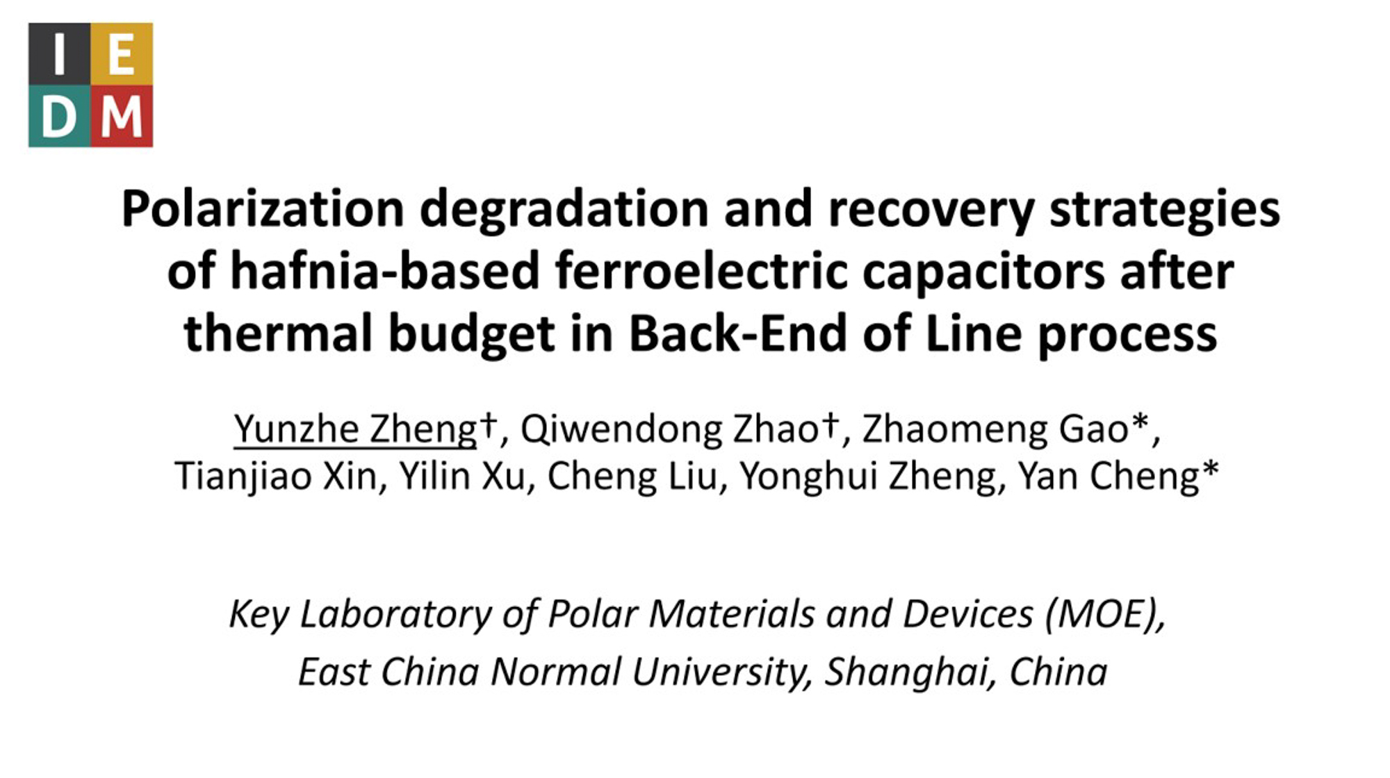 2024年12月7日至11日,第70届IEEE国际电子器件会议(International Electron Devices Meeting, IEDM)在美国旧金山举行。华东师大极化材料与器件教育部重点实验室成岩教授研究团队的最新研究进展,以“Polarization degradation and recovery strategies of hafnia-based ferroelectric capacitors after thermal budget in Back-End of Line process”为题在IEDM 2024会议发表,博士后郑赟喆和硕士研究生赵戚文冬赴美参会,郑赟喆代表研究团队受邀作会议报告。