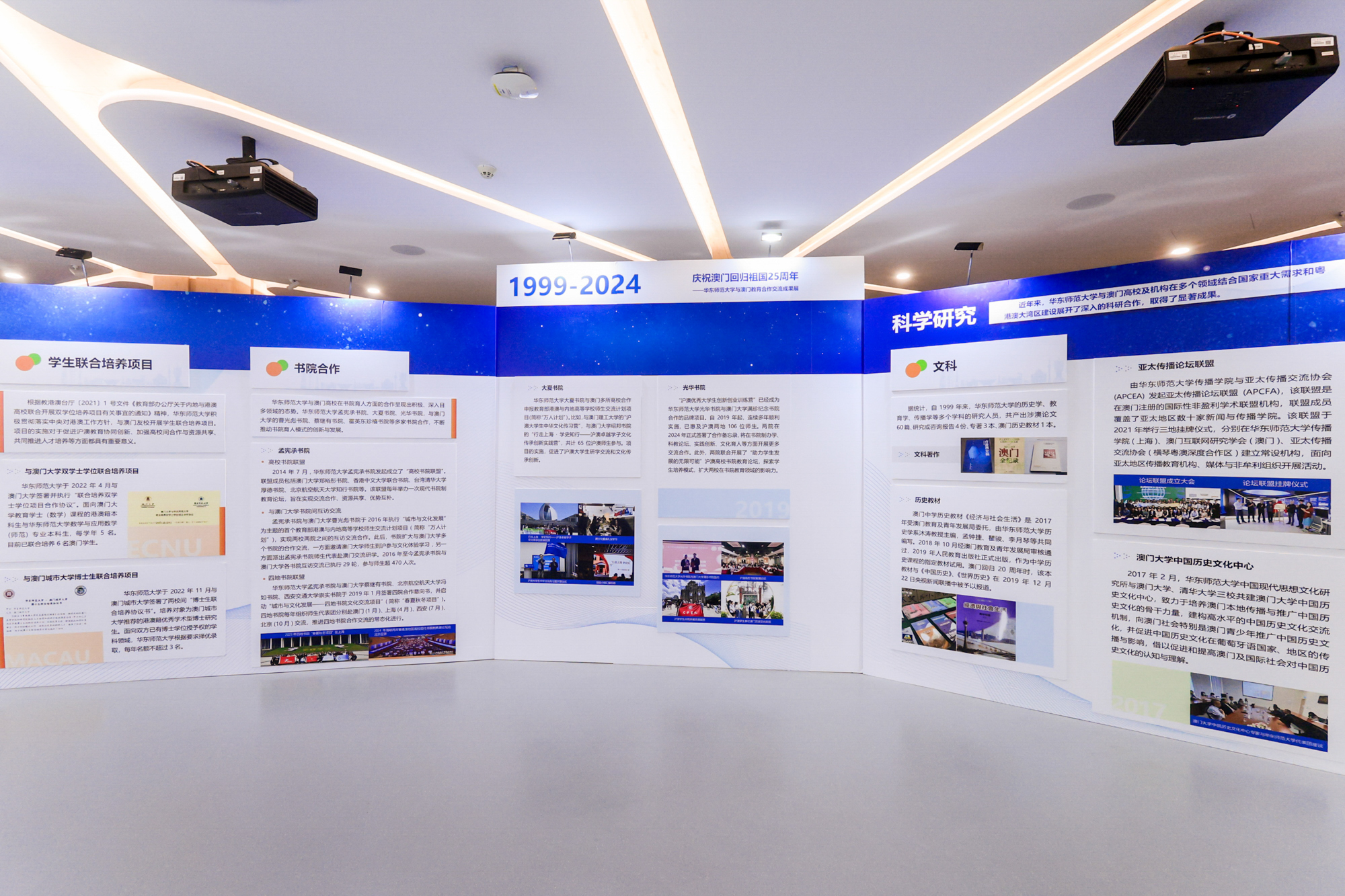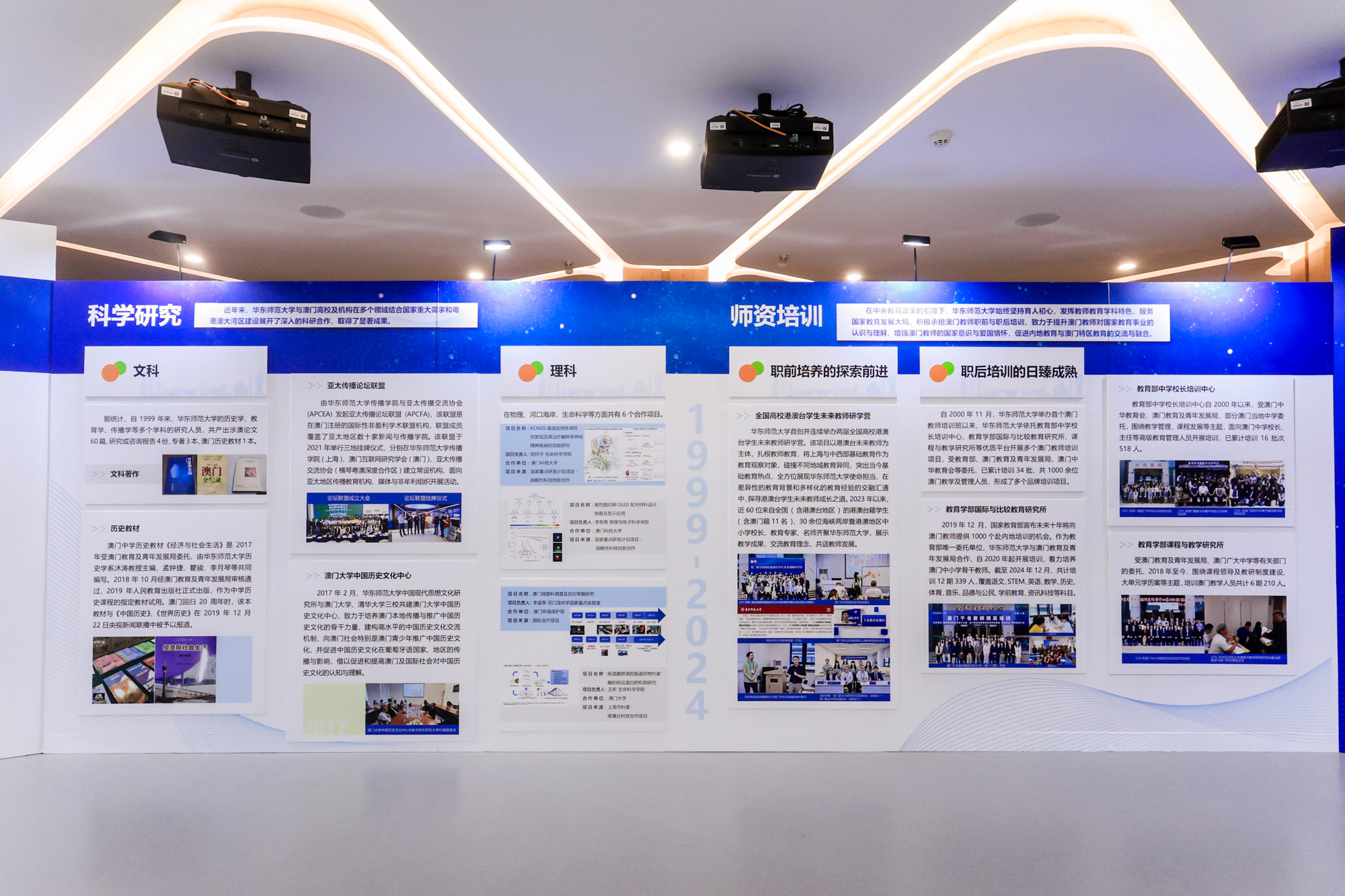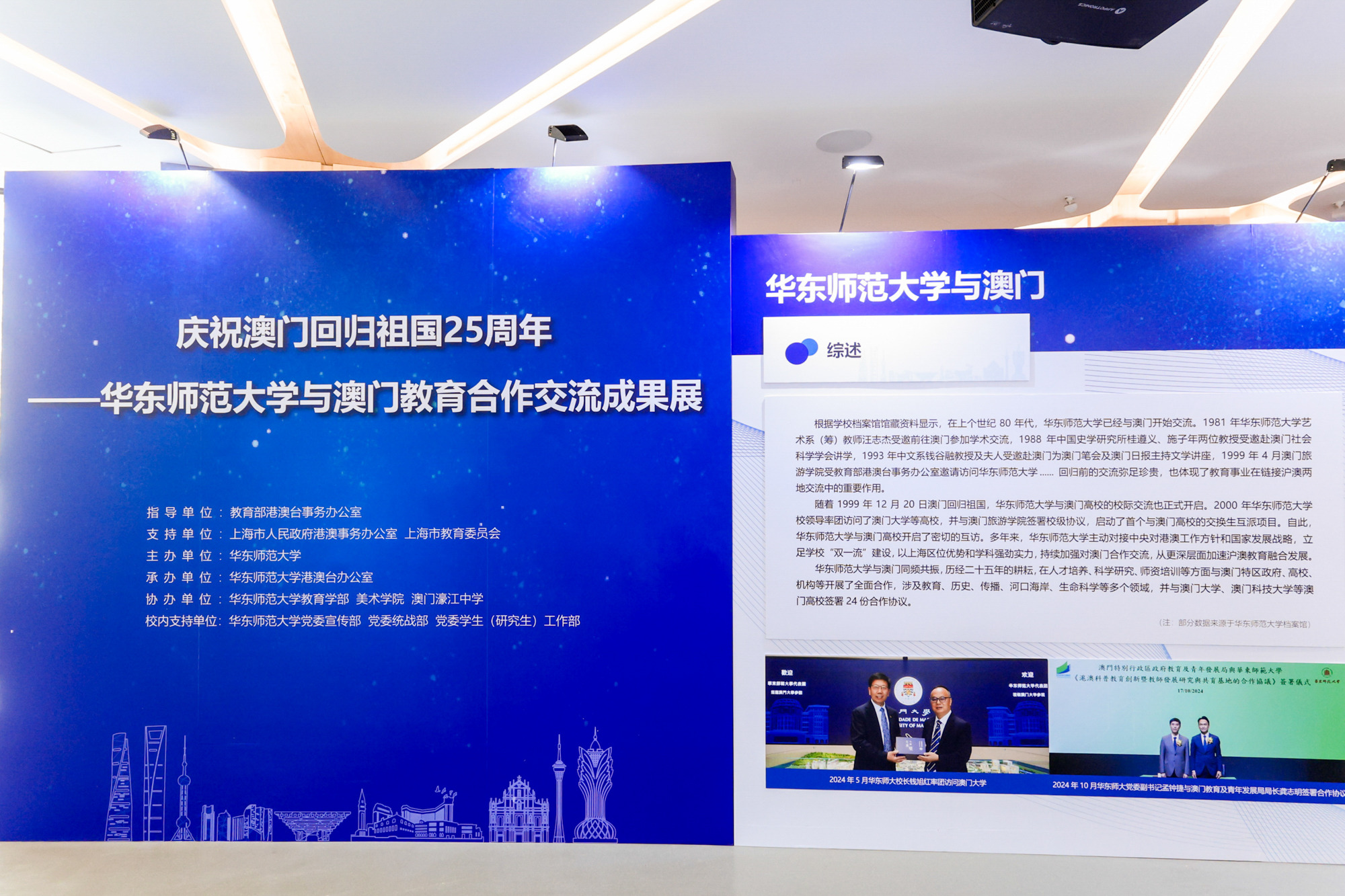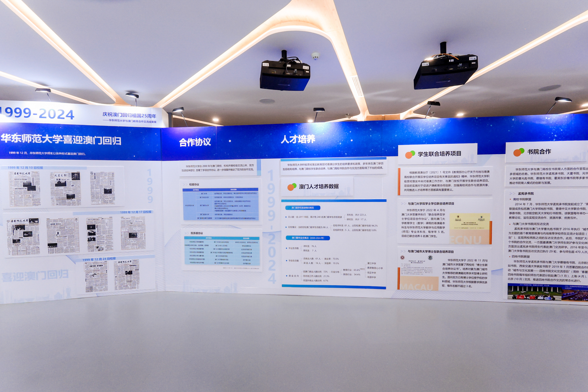 主展览围绕学校与澳门教育合作交流概况、合作协议、人才培养、科研合作、师资培训五个板块,全面展示华东师大与澳门地区教育合作的成果。