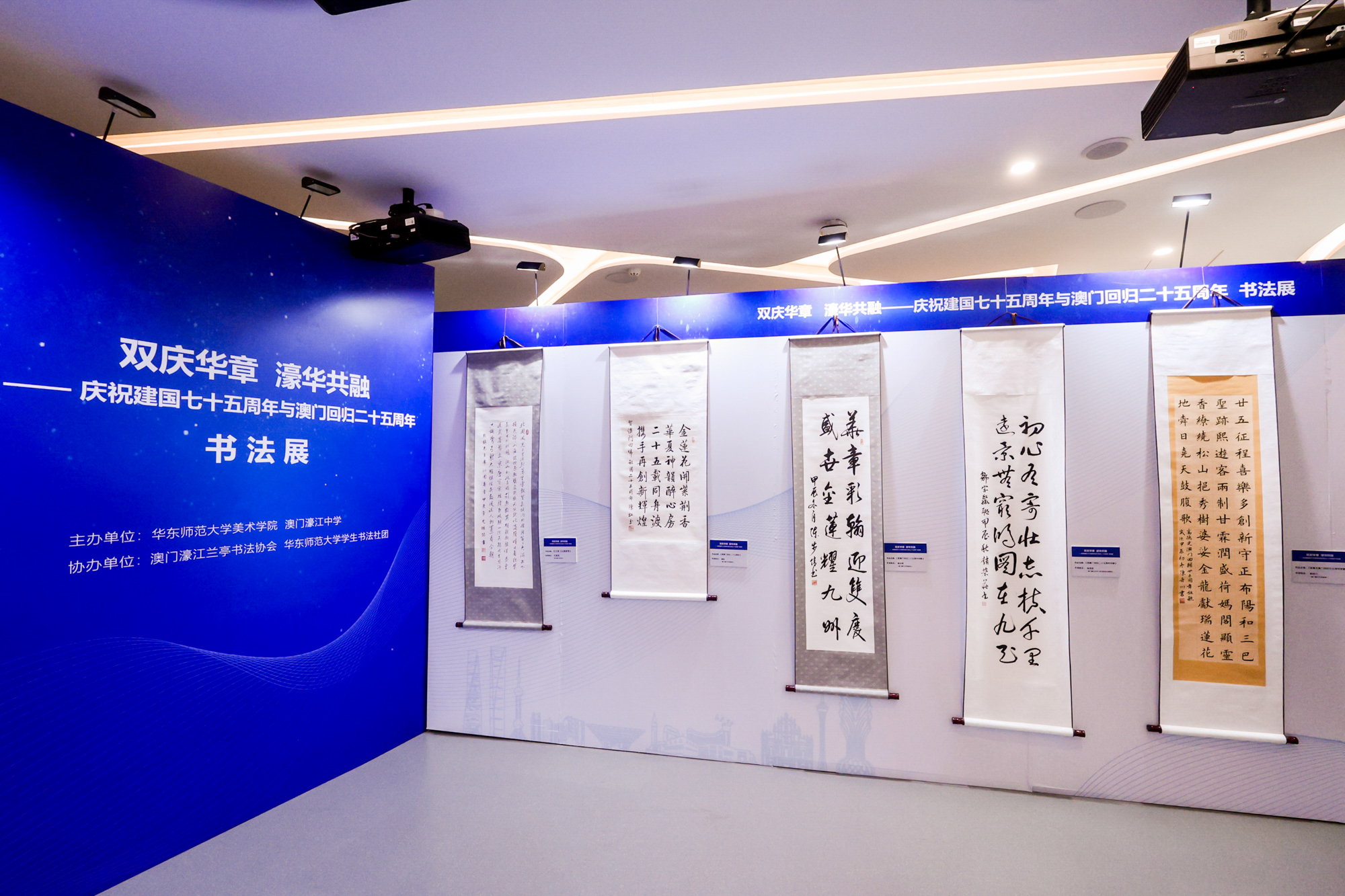 “双庆华章 濠华共融”——庆祝建国七十五周年暨澳门回归二十五周年书法展是由华东师大与澳门濠江中学共同主办,旨在通过两地青年学子的笔墨交流,展现书法艺术的独特魅力,促进沪澳两地的文化交流。展览汇聚了16幅精心遴选的书法作品,通过两地青年才俊的笔墨交融,不仅展现书法艺术深邃而独特的韵味,更以此为契机,深化沪澳两地文化互动,共绘文化交流新篇章。