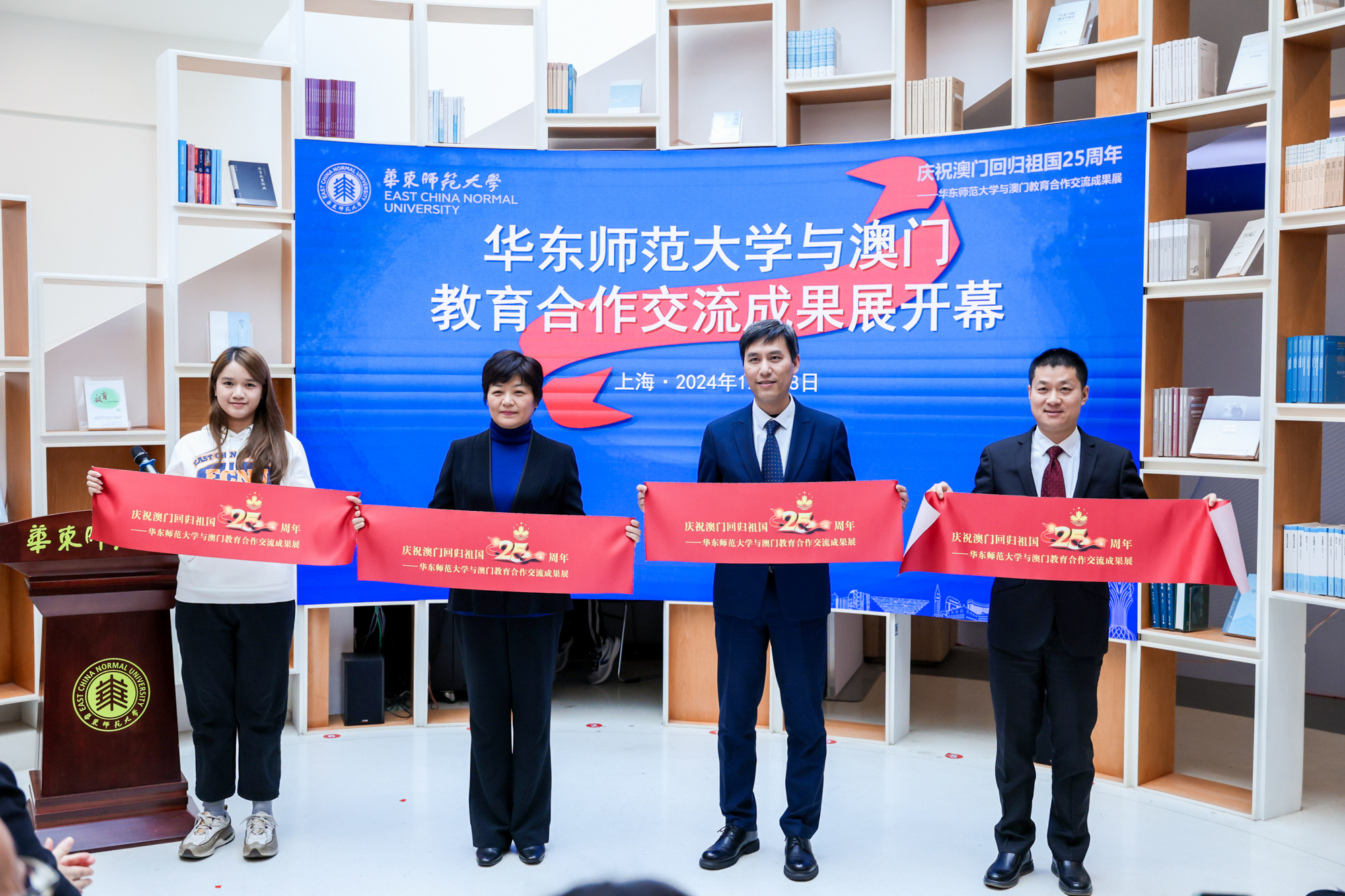 上海市政府港澳事务办公室副主任叶靓、上海市教委港澳台办公室副主任陈皞,华东师大党委副书记孟钟捷和澳门籍学生汤可蓓共同为成果展开幕剪彩。