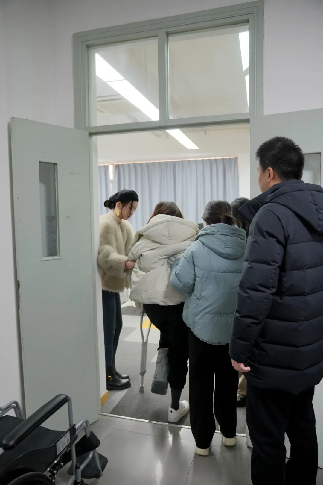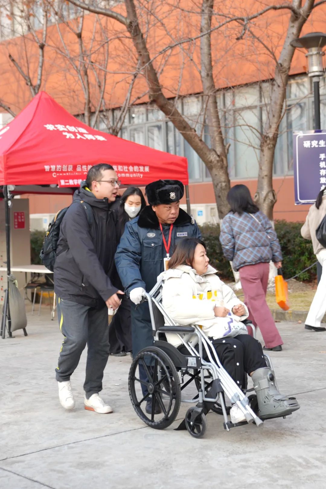 “骨折了怎么到校考试?”考点为行动不便的考生“保驾护航”,调换低楼层考场,安排“宽松”考位,协助入场,提供合理便利。