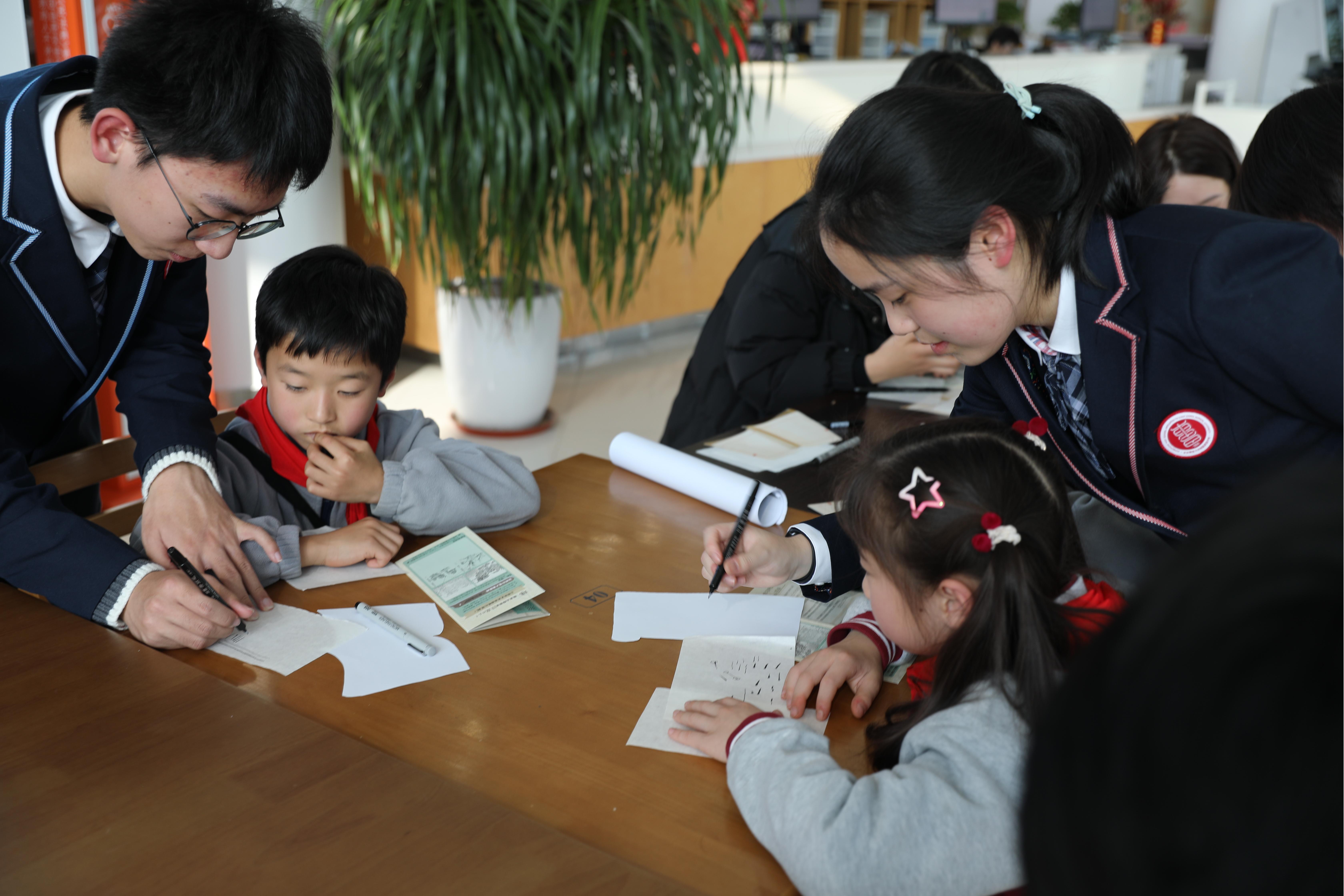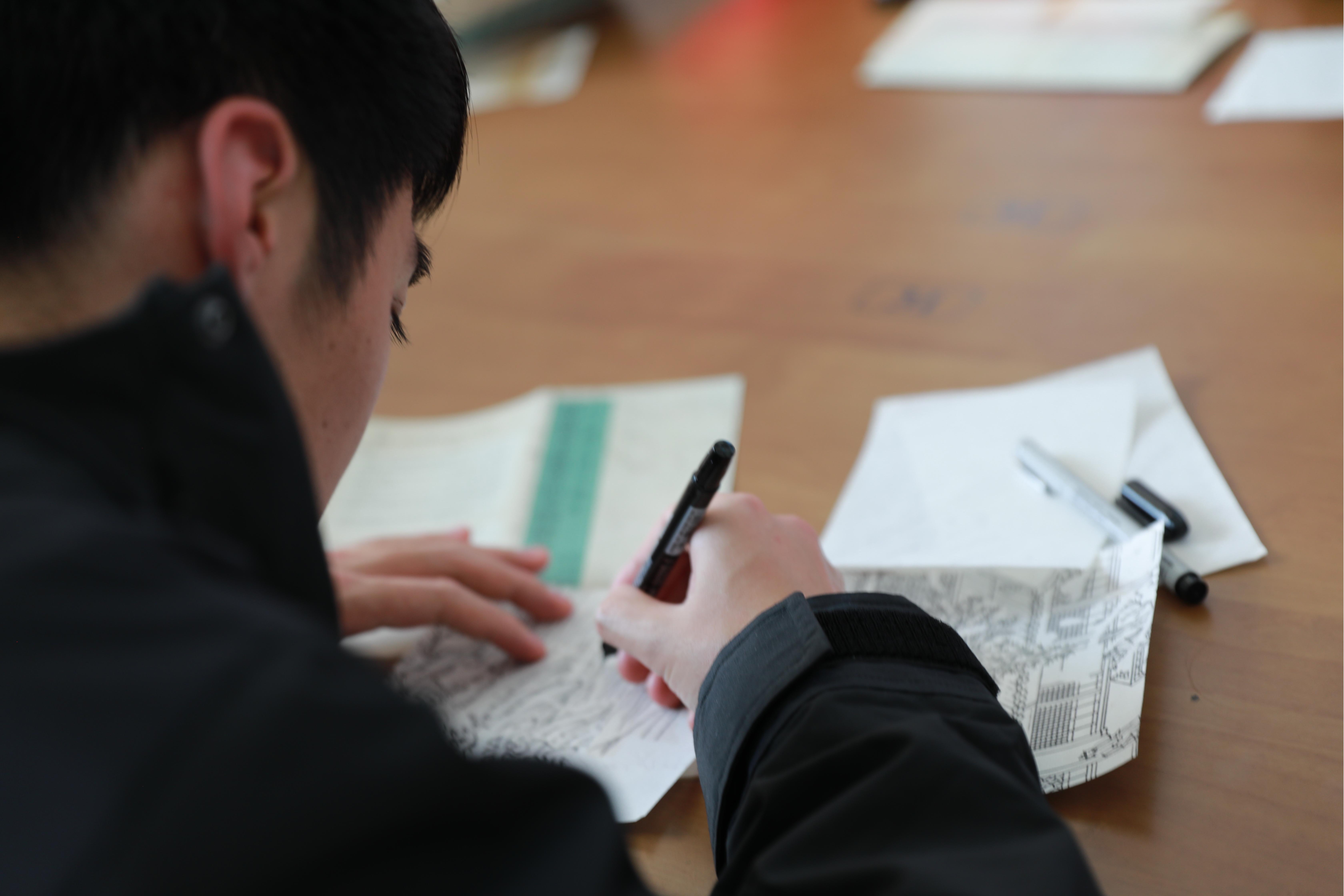 在附属东昌中学师生的悉心指导下,参与者深入学习古籍修复的四种补笔笔法:实体实收、实体续收、虚体实收、虚体虚收,并尝试修复“清华品秋”“文汇读书”“绿野泛舟”三张残页的样品。参与者需要通过手工临摹和接画其中的一个部分来完成小组合作修复,最后将多人修复的小纸本组合成一幅完整的画面。师生们通过填写古籍修复学习单,记录下修复过程中的心得与体会,这些留言真实记录了每个人的文化情感体验之旅。