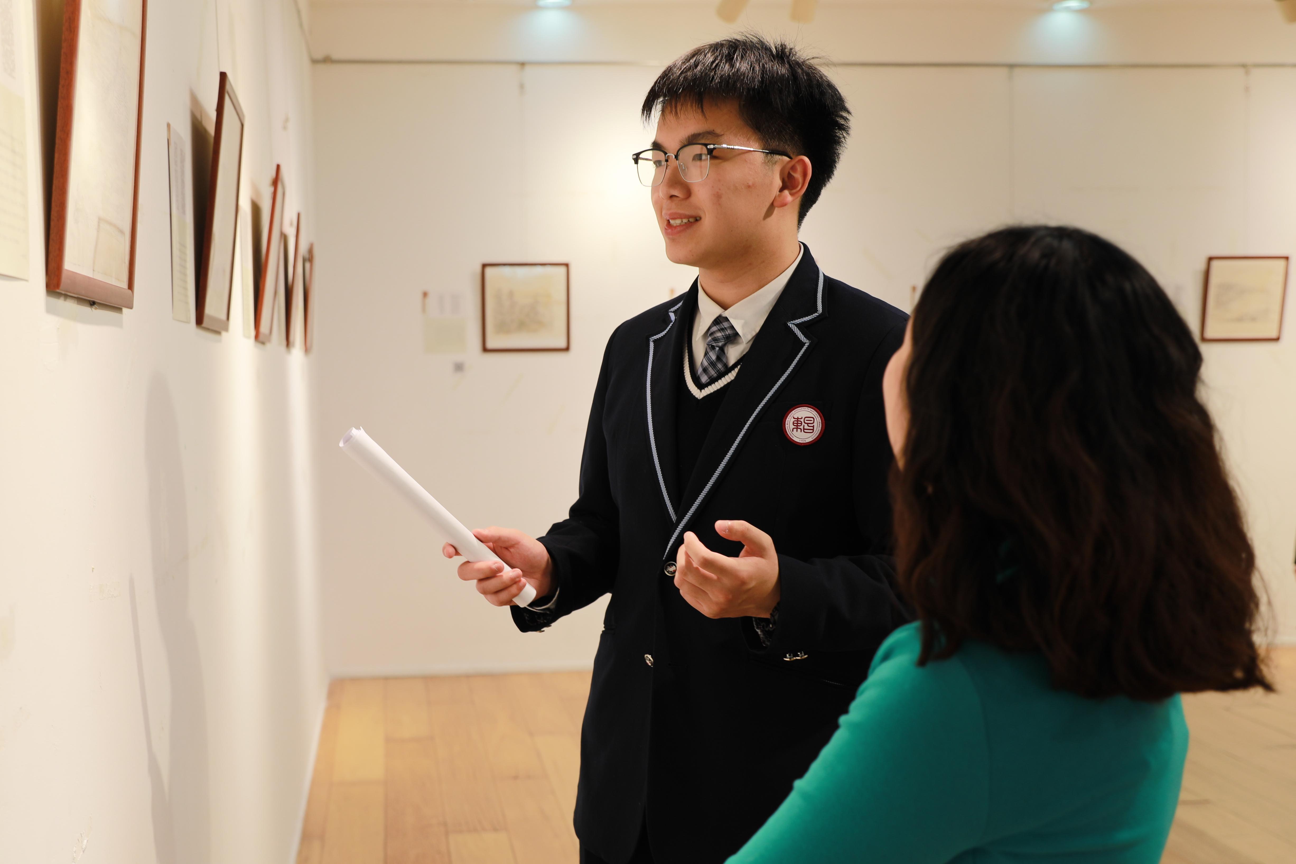 12月27日,在樱桃河之畔的永利皇宫登录官网闵行校区图书馆里,一场名为“让古籍在指尖重生:照进美术教育的文物修复之光”的展览悄然拉开序幕。展览现场,十位来自附属东昌中学的高中生,身着统一的校服,眼神中闪烁着对古籍修复的热爱与敬仰。他们如同十位小小守护神,穿梭在33件精美的修复作品之间,为大小观众们带来了一场别开生面的导览之旅。他们的话语轻柔而富有感染力,引领着每一位观众走进古籍修复的世界,感受那份跨越时空的对话。与此同时,观众还可以通过音频导览,聆听那些残片修复背后的故事。