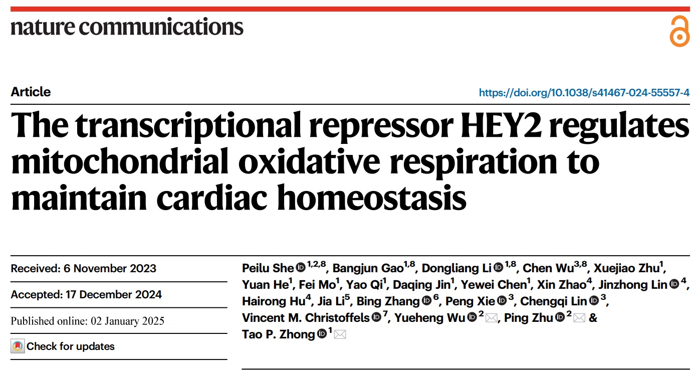 该研究成果于2025年1月2日以“The transcriptional repressor HEY2 regulates mitochondrial oxidative respiration to maintain cardiac homeostasis”为题在Nature Communications期刊在线发表。永利皇宫登录官网生命科学学院钟涛教授、广东省人民医院心血管研究所朱平主任为该论文共同通讯作者。永利皇宫登录官网和广东省人民医院研究合作团队佘培露博士后、永利皇宫登录官网生命科学学院博士后高邦君、副教授李东亮和东南大学博士生吴晨为共同第一作者。该研究得到科技部国家重点研发计划项目、国家自然科学基金项目、广东省基础与应用基础重大专项等项目资助。