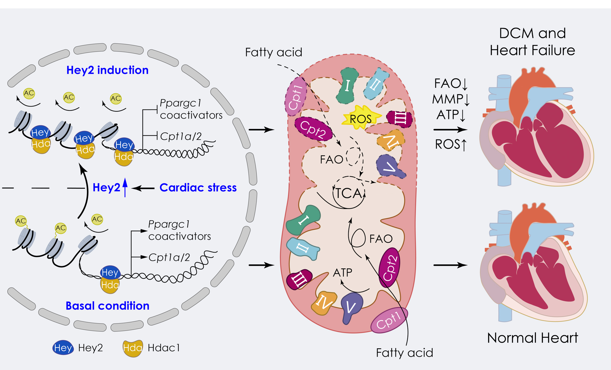 最后,研究人员在成年小鼠心脏中诱导Hey2敲除,观察到线粒体氧化呼吸链和能量代谢基因表达增加,左心室射血分数升高,进而增强心脏功能,并且能够缓解阿霉素诱导的心肌损伤和衰竭。因此,在正常生理状态下,HEY2通过招募HDAC1,调控组蛋白去乙酰化和染色质可及性,限制能量代谢共激活因子(Ppargc1)和脂肪酸氧化基因(Cpt1a/Cpt2)的过度表达,实现心脏代谢和功能的稳态维持;而在应激状态下,HEY2表达升高,Ppargc1和Cpt1a/Cpt2转录受到抑制,从而降低线粒体氧化呼吸和能量生成,诱发心脏扩张与衰竭(图3)。综上所述,该研究揭示了HEY2/HDAC1-Ppargc1/Cpt轴协调线粒体代谢、心脏功能及稳态维持的新型生物学机制,有望为扩张性心肌病和心力衰竭提供潜在干预策略。
