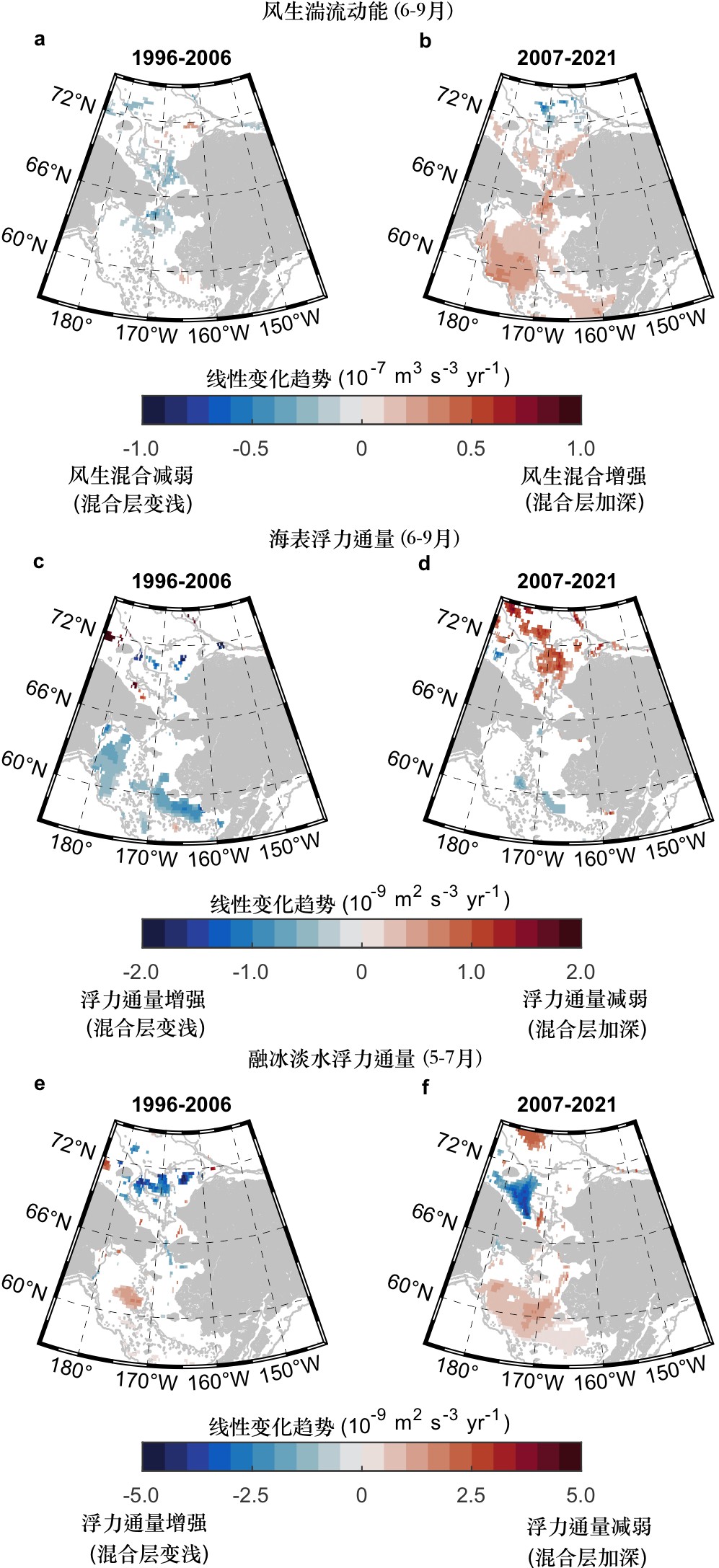 研究团队进一步运用一维海冰-上混合层解析模型,计算风应力、融冰淡水和海气浮力通量对混合层的相对贡献。结果表明,1996-2006年间夏季混合层变浅主要由海气热通量和融冰淡水所导致,其中位于楚科奇海北部海冰边缘区附近的融冰淡水浮力通量增强最为显著。2007年以后,随着融冰期不断提前,融冰淡水对夏季(6-9月)混合层的浮力贡献逐步减小。与此同时,无冰期延长以及风应力的增加促进了风生混合作用,夏季混合层转变为加深的趋势(图3)。