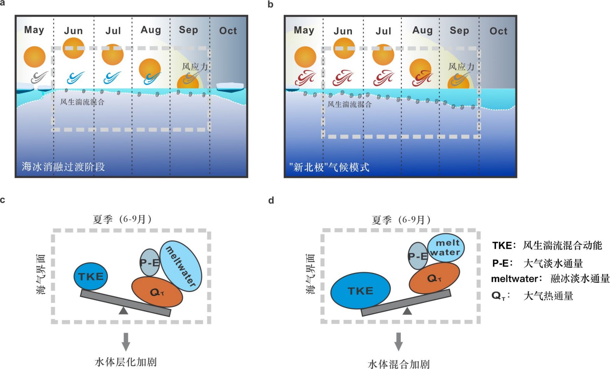 该研究的创新点是成功捕捉到北极太平洋扇区海洋环境要素突变的信号,揭示了海冰持续减退导致上混合层主控因素从海气浮力通量向风应力转变的新机制(图4),而此前这种转变未被充分认识。随着夏季少冰或无冰成为北极新常态,不断变化的海洋环境和动力机制可能会彻底改变北冰洋冰藻-浮游-底栖耦合的生态系统结构,将对未来北极食物网稳定性造成很大的不确定性。