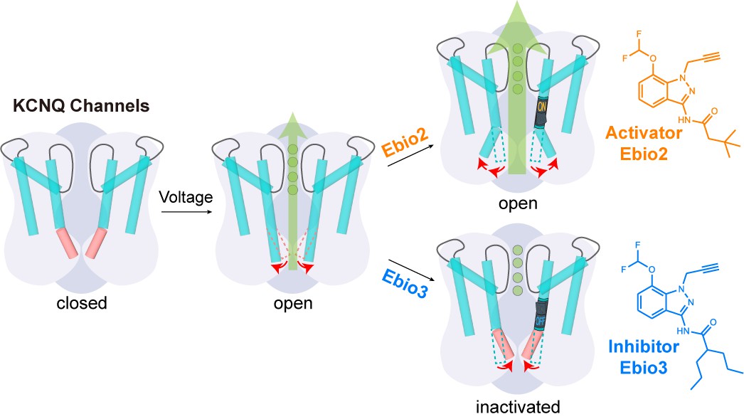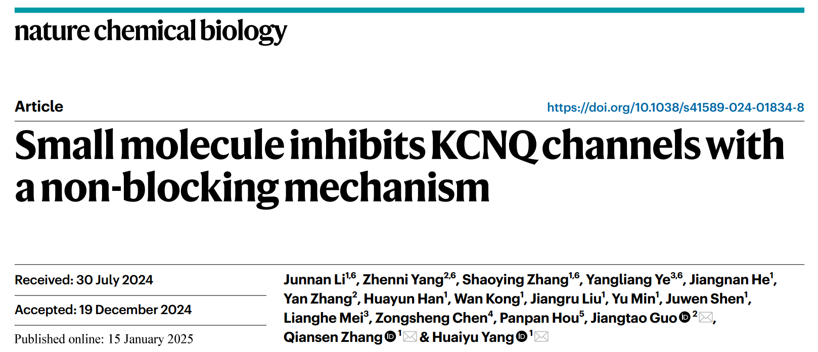 离子通道具有广泛且重要的生理和病理功能,是药物靶标和潜在药物靶标的重要来源。为了解决靶向离子通道药物发现的堵点问题,永利皇宫登录官网生命科学学院和药学院阳怀宇课题组持续构建离子通道新调控理论,提出跳出静态结构的局限,从离子通道动态构象中寻找调控机遇。该团队与合作者发现小分子不仅可以靶向离子通道自有动态构象,还可以创造离子通道新构象。近日,阳怀宇教授、张乾森青年研究员与浙江大学基础医学院郭江涛研究员开展深入合作,在利用小分子创造离子通道构象和电生理功能研究中取得新突破,发现可诱导非失活类的电压门控钾通道 KCNQ2 产生失活态的小分子,揭示了小分子诱导激活态产生门控关闭的新型抑制机制,研究成果于2025年1月15日以“Small molecule inhibits KCNQ channels with a non-blocking mechanism”为题在线发表于 Nature Chemical Biology 杂志。