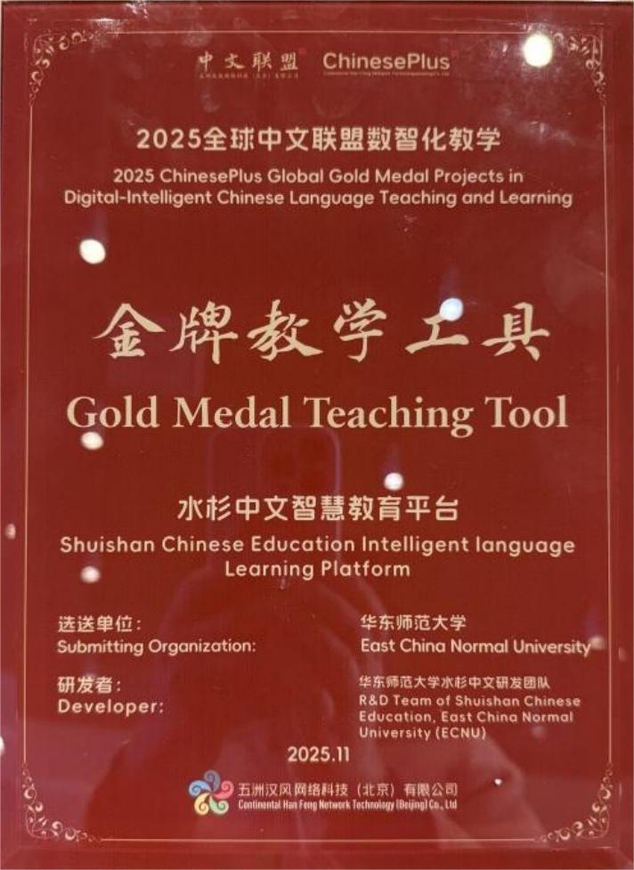 在2025世界中文大会上,永利皇宫登录官网自主研发的“水杉中文(Shuishan ChineseEdu)”智慧教育平台荣获“2025全球中文联盟数智化教学金牌教学工具”,并作为全球仅有的12个覆盖“教、学、研”全场景的国际中文AI产品之一,首发入驻中文联盟新平台。华东师大因在数智化国际中文教学领域的卓越综合实力,获评“2025全球中文联盟数字化教学金牌合作伙伴”。
