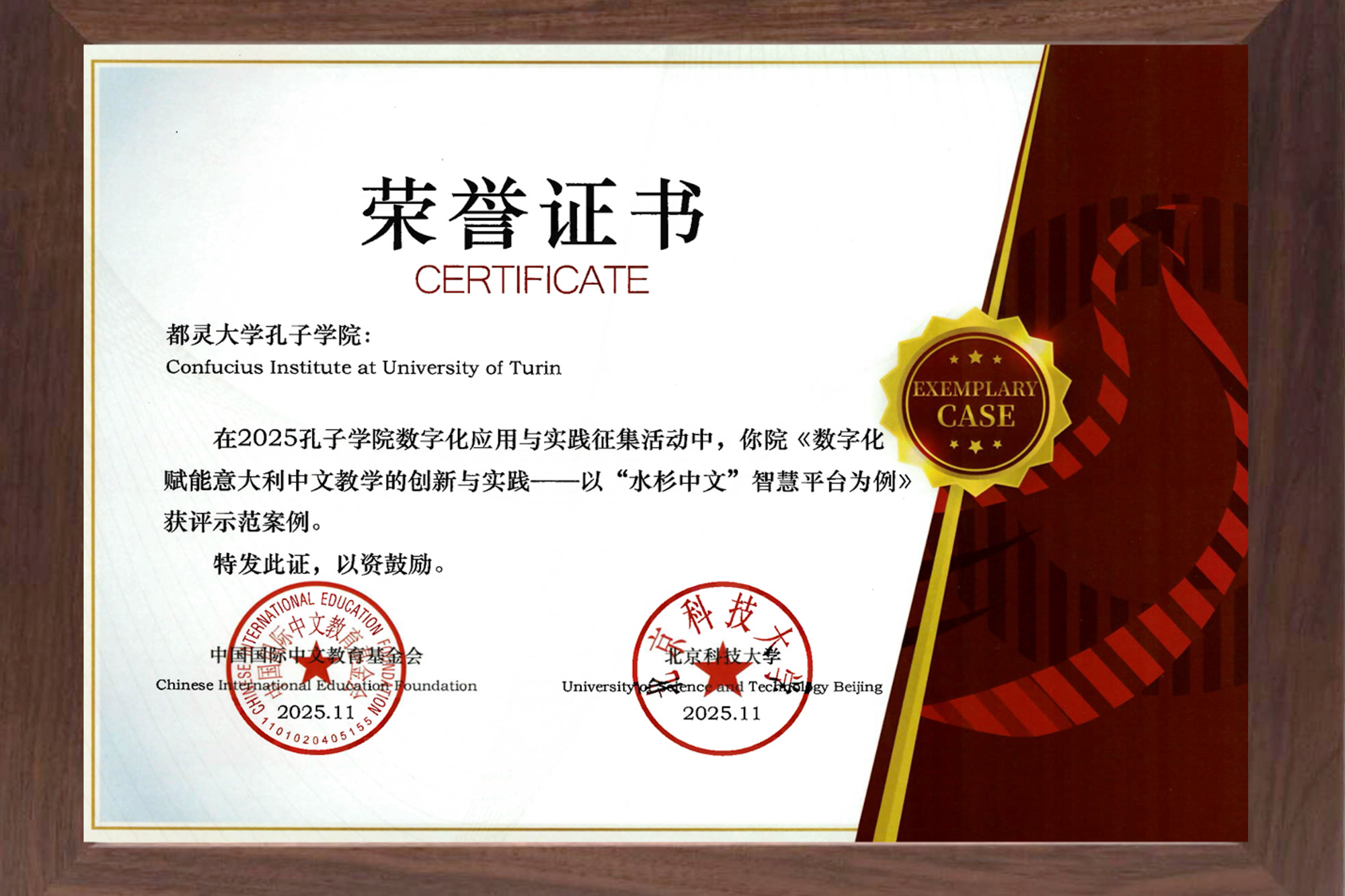 意大利都灵大学孔子学院提交的“水杉中文”相关案例荣获“2025孔子学院数字化应用与实践示范案例”