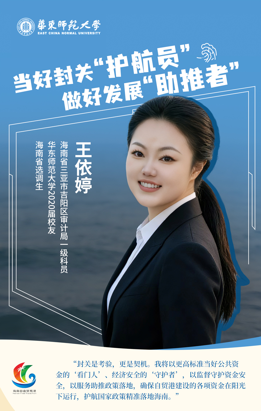 基层一线、田间地头,也呼唤着青春和智慧的力量。王依婷从华东师大毕业后成为一名选调生,进入三亚市吉阳区审计局工作。工作5年来,她屡获佳绩,主审的审计项目先后获省级二等奖1次、省级三等奖2次、市级一等奖1次;期间,她还深入乡村开展为期两年的驻村工作。从审计项目的细致核查,到田间地头的奔走协调,王依婷的工作轨迹跨越了账本与乡野,展现一名选调生师大人在自贸港建设中的担当。