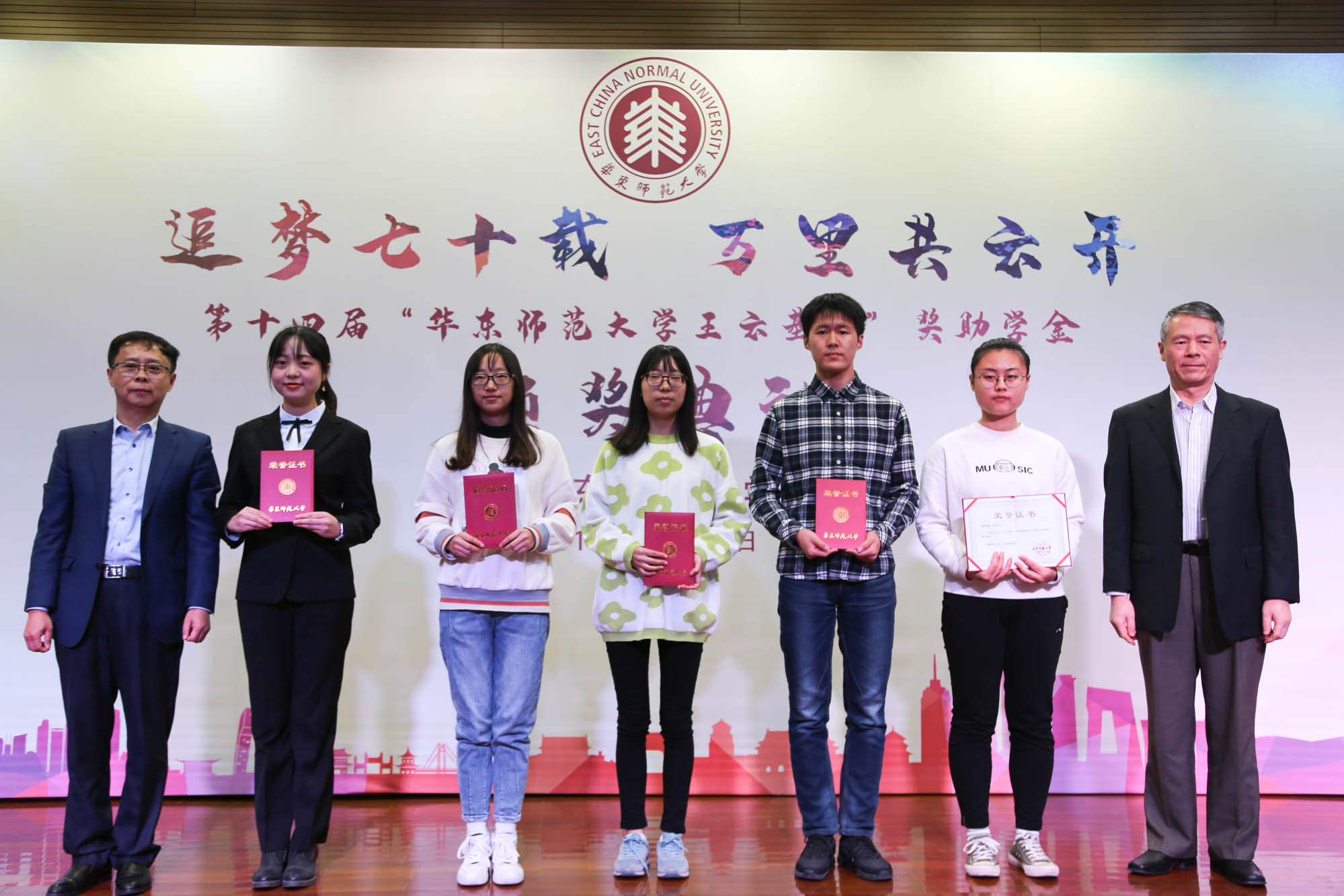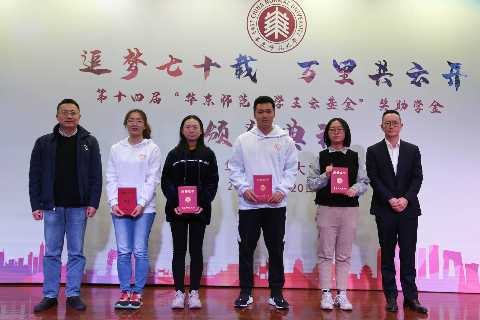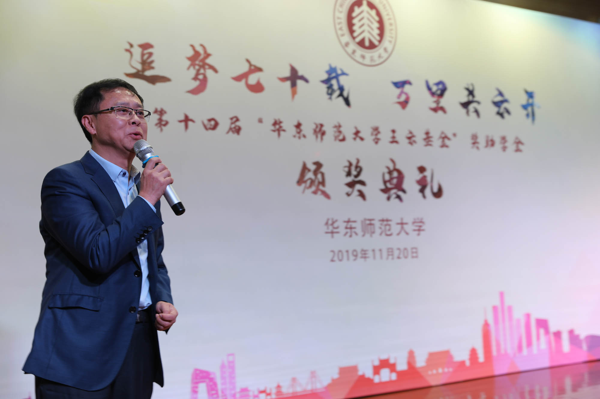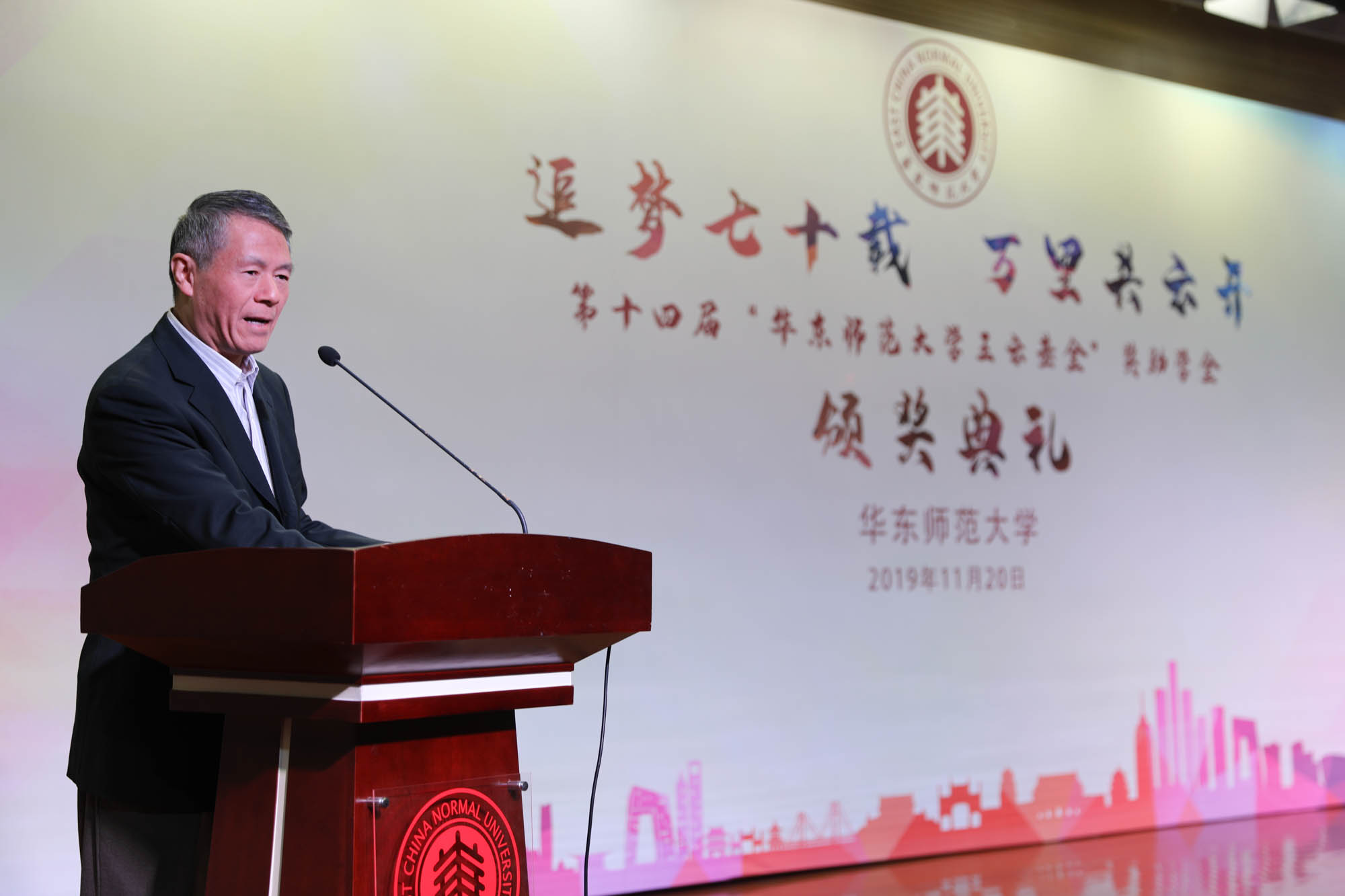 颁奖典礼上,杨昌利在致辞中感谢王云先生以及明泉集团十四年来为我校学子的成长成才、为华东师大的发展所作出的重要贡献,并感谢上海市慈善基金会长期以来对我校建设发展的关心支持。王云先生用自己的行动诠释了一位成功企业家的责任和担当,更以自身的励志创业、捐资助学和公益慈善,帮助和激励学生筑梦、追梦、圆梦。杨昌利希望同学们能以此为楷模和榜样,将青春梦融入伟大的中国梦,发奋图强、积极进取,学有所成、回馈社会。张斌代表明泉集团再次向我校捐赠人民币85万元,用于支持我校的学生资助工作,帮助困难学生、奖励优秀学子。