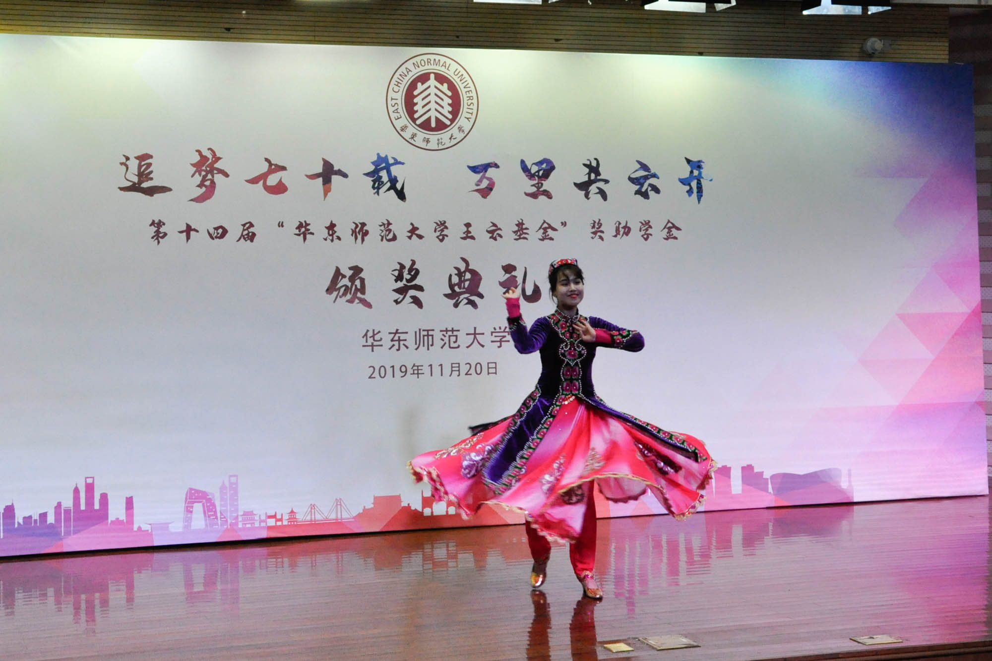 典礼上,云友会同学2019级大夏书院的麦迪娜依·阿合买提,特表演新疆舞蹈《丝路精灵》,以此代表所有获奖受助同学向王云先生以及明泉集团、上海市慈善基金会和学校领导、老师们长期以来的关怀和帮助表达感激之情。