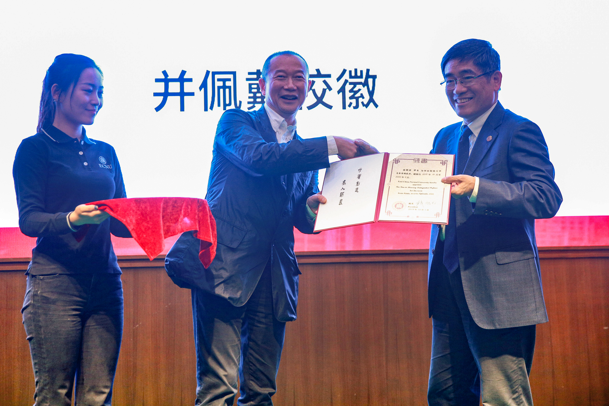 10月25日上午,著名音乐家、作曲家、指挥家谭盾在丽娃河畔受聘为永利皇宫登录官网荣誉特聘教授。华东师大“谭盾未来音乐研究中心”揭牌成立。仪式上,华东师大党委书记童世骏向谭盾颁发荣誉特聘教授证书,并为他佩戴华东师大校徽。