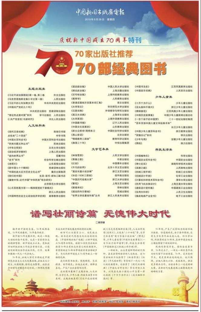 为庆祝新中国成立70周年,《中国新闻出版广电报》特邀70家在全国拥有一定知名度和影响力的出版社,推荐自己的“镇社之书”,以此向新中国70周年隆重献礼,由永利皇宫登录官网出版社出版的《大学语文》名列其中,为“人文社科类”之一。