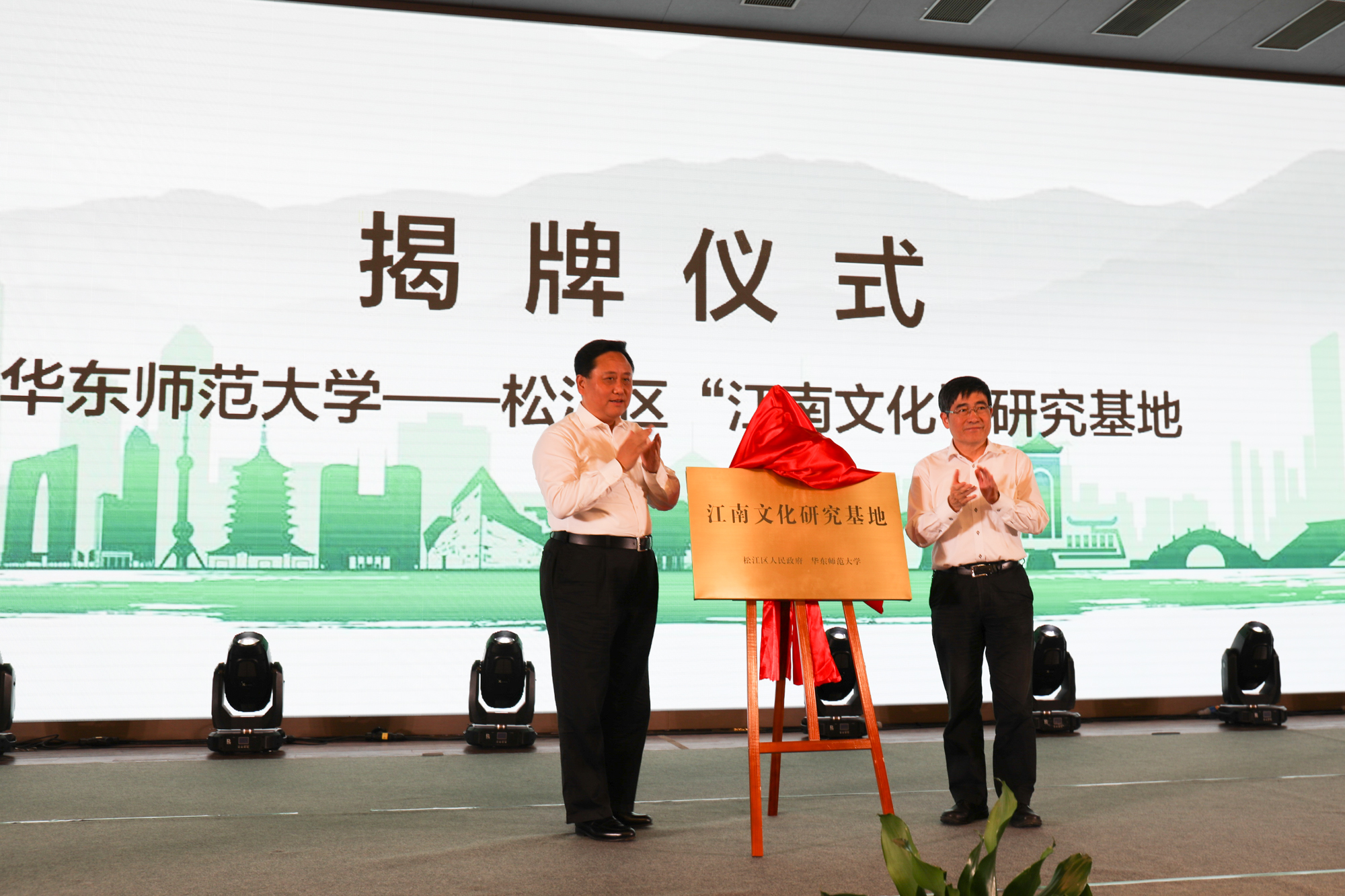 松江区委书记程向民和华东师大党委书记童世骏为华东师大——松江区“江南文化”研究基地揭牌