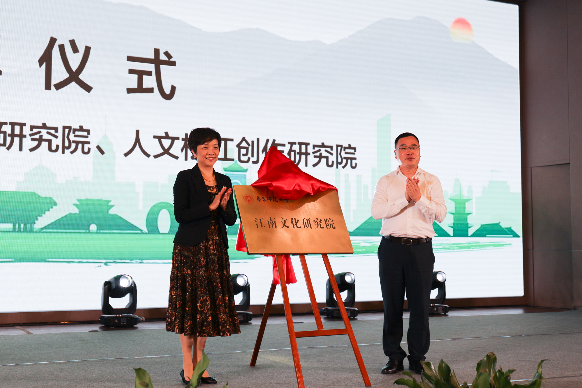 上海市文化和旅游局党委书记、局长于秀芬和松江区委副书记、区长陈宇剑为江南文化研究院、人文松江创作研究院揭牌