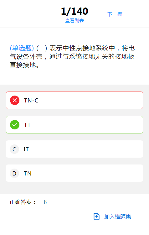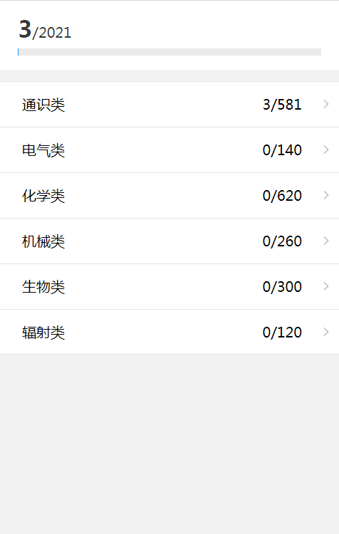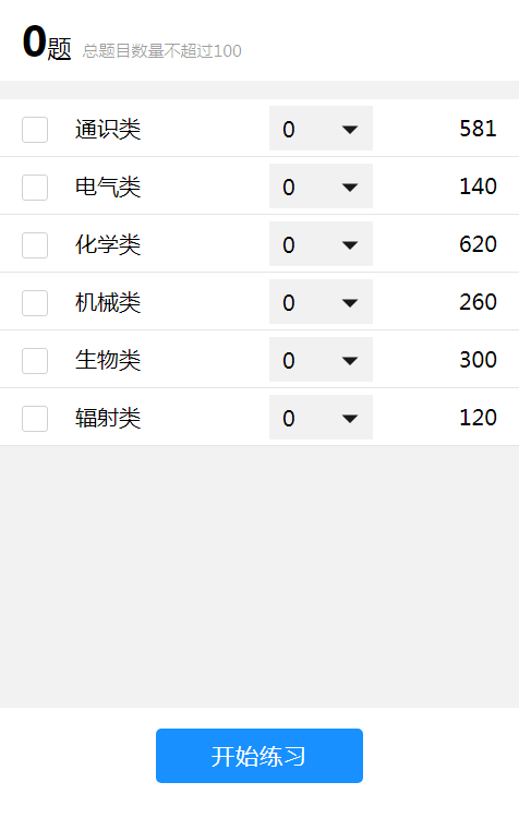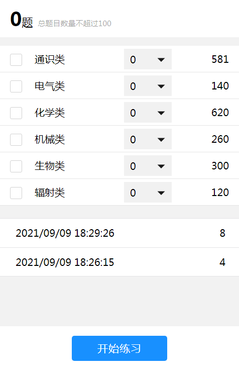 题库含通识类(581道)、电气类(140道)、化学类(620道)、机械类(260道)、生物类(300道)、辐射类(120道)六类题型共2021道题。学生自主选择一类题型开始练习,练习过程中选择答案后会出现正确答案,错题自动进入错题集,若对题目有疑问或不确定可手动点击“加入错题集”;点击“查看列表”,可显示当前题库答题信息(正确/错误/未作答)。