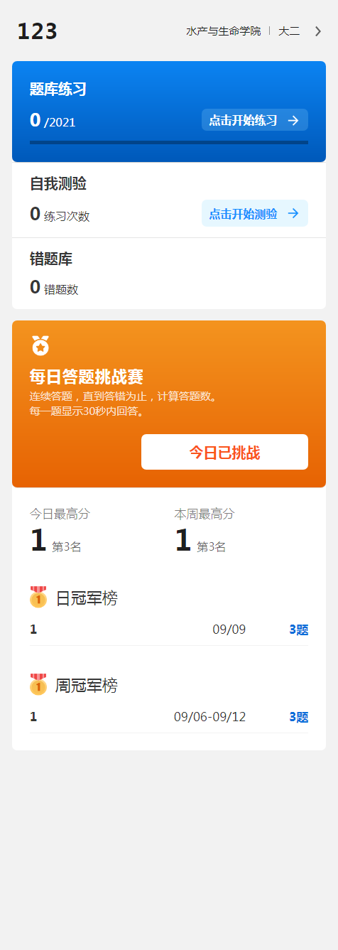 所有注册学生每人每天可以进行一次在线挑战答题,系统在题库中随机抽题,每题答题时间为30’,每答对一题得1分,答对进入下一题,答错或答题时间结束,挑战终止,所获分值为该学生的当日参赛积分。