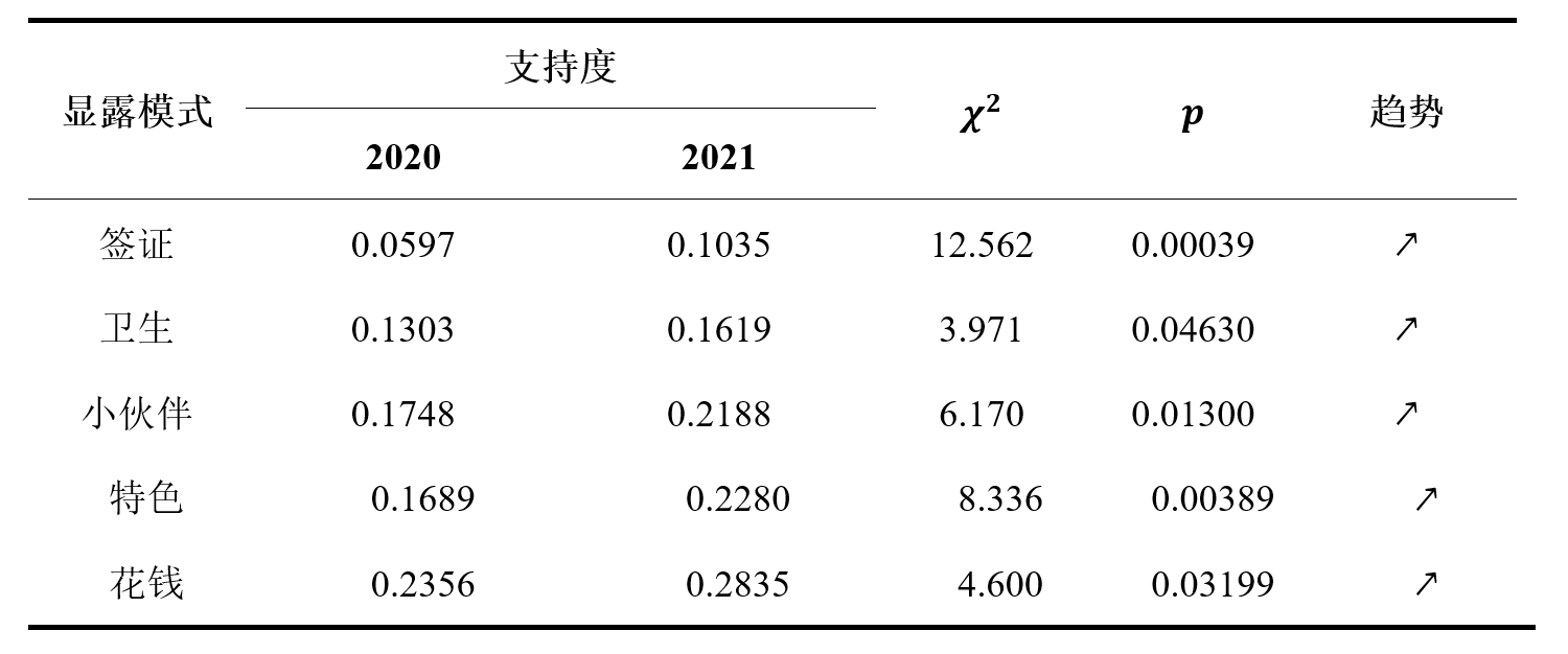 而后一时间段的显露模式识别结果大不相同。“签证”和“卫生”开始成为人们关注的焦点。结合时事新闻可知,2020-2021年,越来越多的国家开始限制境外人员输入,可以解释“签证”的关注度上升明显的原因,这也在侧面说明国内用户对于跨境旅行的需求较大。“卫生”一词则解释了这个时间段内用户对于旅游出行的安全需求。旅游作为一项重要的人口流动活动,顺理成章成为病毒传播的重要途径。旅游产品的卫生状况、旅游目的地的防疫措施、个人在旅途中的卫生防护等都成为该时期安全需求的一个重要方面。
