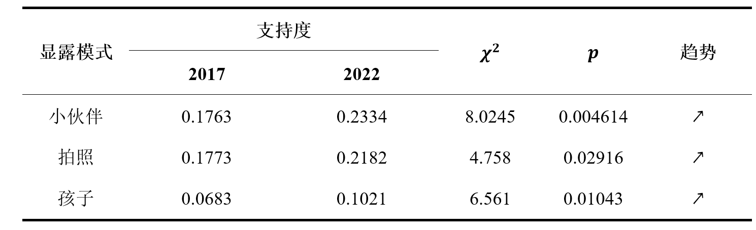 进一步对数据集进行显露模式挖掘,发现2017-2019年段的显露模式集中在社交方面,说明在疫情之前,针对旅游出行的社交需求(情感需求),人们除了欣赏美景,越来越重视陪伴家人和朋友一起出门游玩的过程,同时,记录旅途中美好时光相互分享也可以满足自身的社交需求。