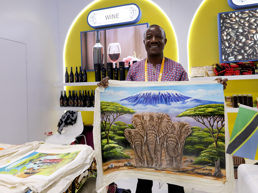 在第七届进博会国家展坦桑尼亚馆,一名参展商展示绘画作品。