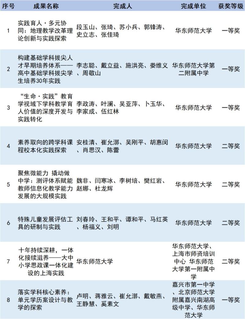 引人注意的是,在基础教育(含幼儿教育与特殊教育)领域,华东师大一举获得6项大奖,其中包括含金量最高的一等奖奖项。由华东师大基础教育与终身教育发展部部长、华东师大二附中原校长李志聪领衔《构建基础学科拔尖人才早期培养体系——高中基础学科拔尖学生培养30年实践》获得一等奖;黄大年团队成果、教育学部李政涛教授领衔的《“生命·实践”教育学视域下学科教学育人价值的深度开发与实践转化》,地理科学学院段玉山教授领衔的《实践育人·多元协同:地理教学改革理论创新与实践探索》,也获一等奖。