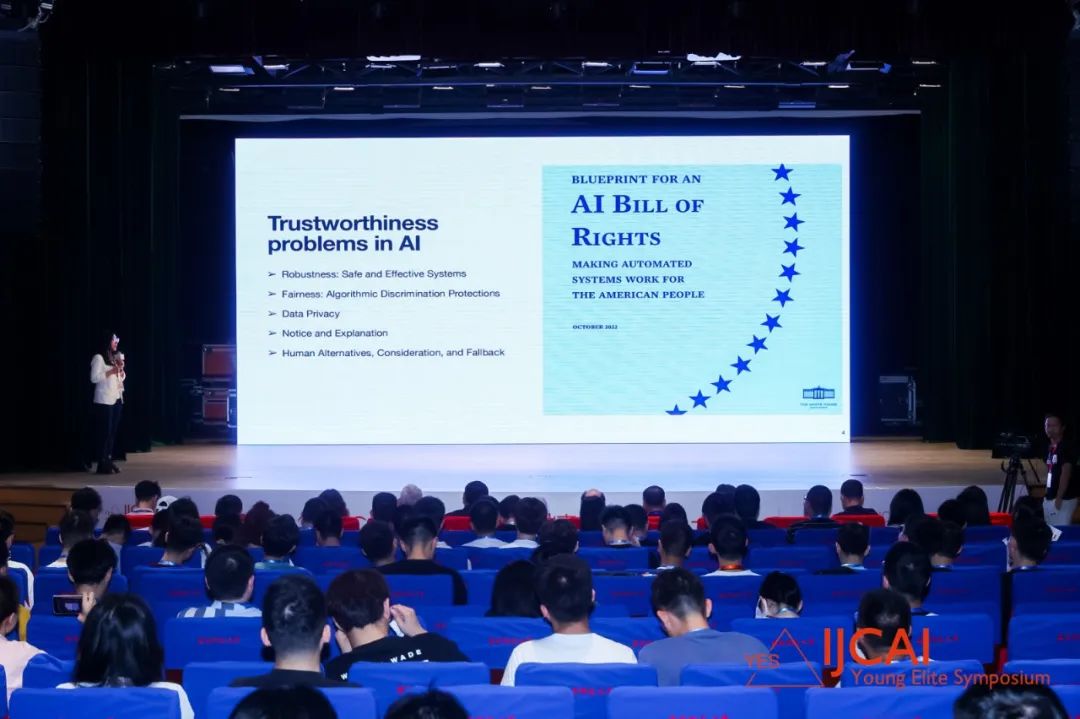 IJCAI-SAIA中国联合办公室秘书长邵怡蕾博士介绍了2023 IJCAI YES会议情况,她指出,面对人工智能时代的来临,全世界、全人类人工智能领域的杰出科学家们,皆秉持着“人类还会在”的信念,探索着“人类如何还在”的道路和方法。基于此背景,作为IJCAI的青年版本,YES邀请了来自全中国、全世界的广大青年学者们来到这里彼此分享研究成果,加深友谊,构建共同的信念。