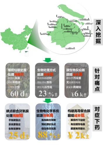 团队在原有“电膜协作”技术的基础上进行创新,使用碳点联合厌氧膜处理技术,让微生物为餐厨污泥处理“打工”,将处置周期减半。但是,这一技术很快又遇上瓶颈:微生物的能源转化效率低,总有一些微生物没有完全发挥自己的能力,在角落里“躺平”。于是,团队多次讨论后又创新引入微生物电化学调控技术,用微电流为微生物做“电疗”,让其从“躺平”变成“撸起袖子加油干”。改进后的工作效率比目前市场最优提高了约34%,经济性显著提高。与此同时,团队还开发了多层复合高导膜组技术,由镀铱钛网、高导电性碳毡和聚偏二氟乙烯平板膜等共同构建的7层高导复合膜组件,在实现原位缓解膜污染的同时将成本降低了54%。