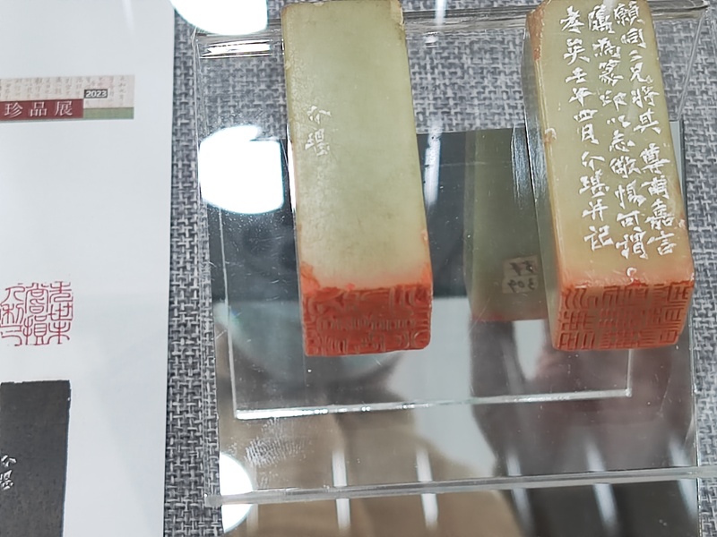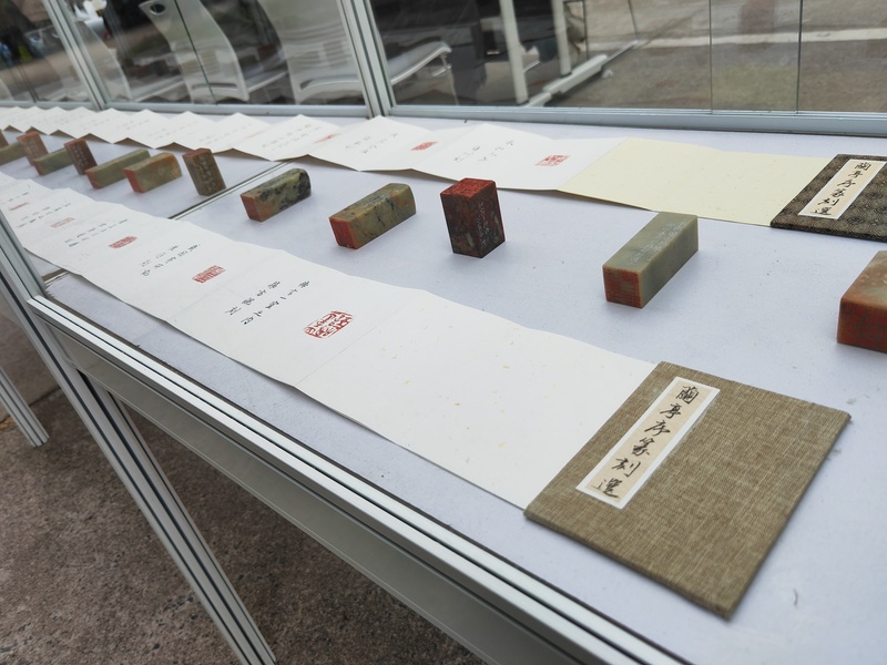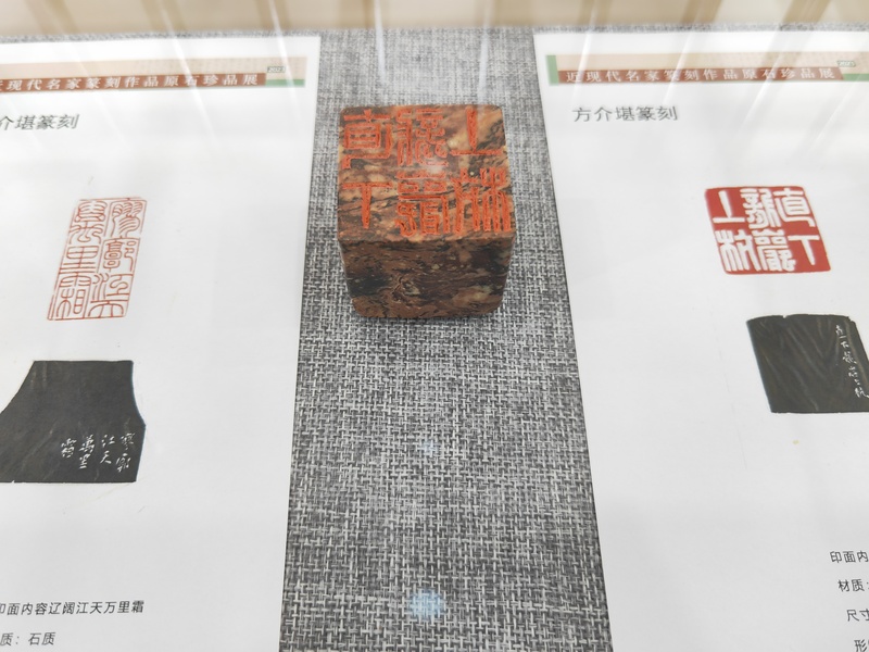 此刻,长廊一侧工作坊内,正在进行“群贤毕至——近现代名家篆刻作品原石珍品展”,展出谢磊明、唐醉石、王福庵、马公愚、赵古泥、方介堪、邓散木等近现代篆刻名家42方原石珍品,并附部分原拓印谱供师生零距离细部观赏,均为老师与同行私人珍藏。