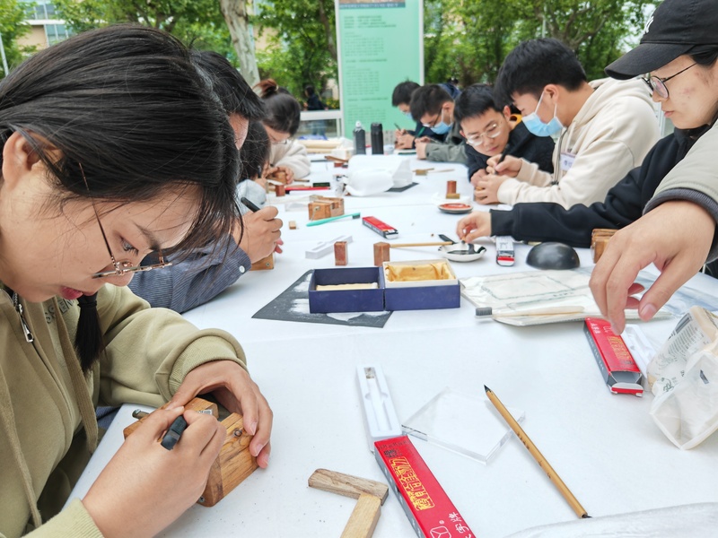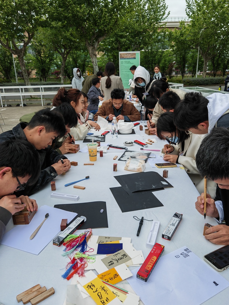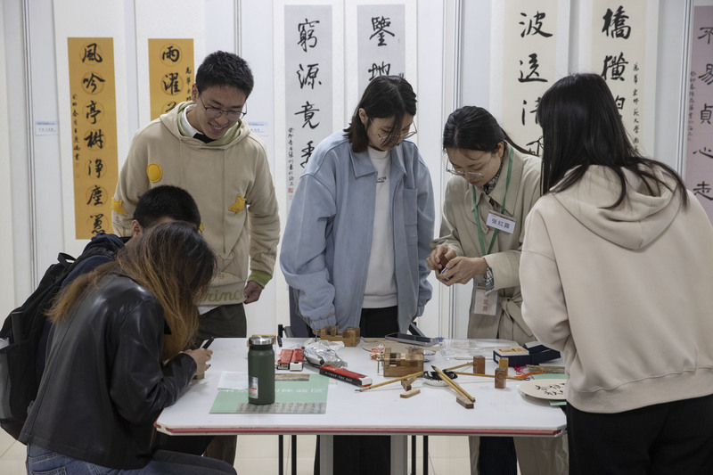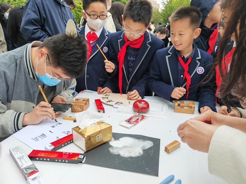 而在午间,作为教育部中华优秀传统文化篆刻传承基地,校园兰亭书法(篆刻)节的体验区,更是引来华东师范附属中小学的“红领巾”们执起刀笔,通过大哥哥大姐姐手把手教授,在方寸之间刻下篆书“大”字。