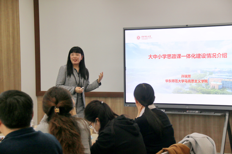 随后,马克思主义学院副院长许瑞芳教授开展了一堂关于“大中小学思政课一体化”的党课,她讲述了要构建“全链条—主题式”来进行课程教学一体化,要打破理念的桎梏,构建“下延—上升”双向教育教学逻辑;要聚焦核心知识模块,建构学段衔接“链条”,破解实施难题;要立足课程根本,开展进阶式主题教学,并向大家展示了上海大中小学同上一堂思政课共讲“劳动创造美好生活”的案例。她提出要形成“全过程-立体式”一体化师资培养培训体系,需要创新“职前职后贯通”的师资培养培训模式,推进层级协同,打破体制机制壁垒,建立共建制度,实现多方联动。