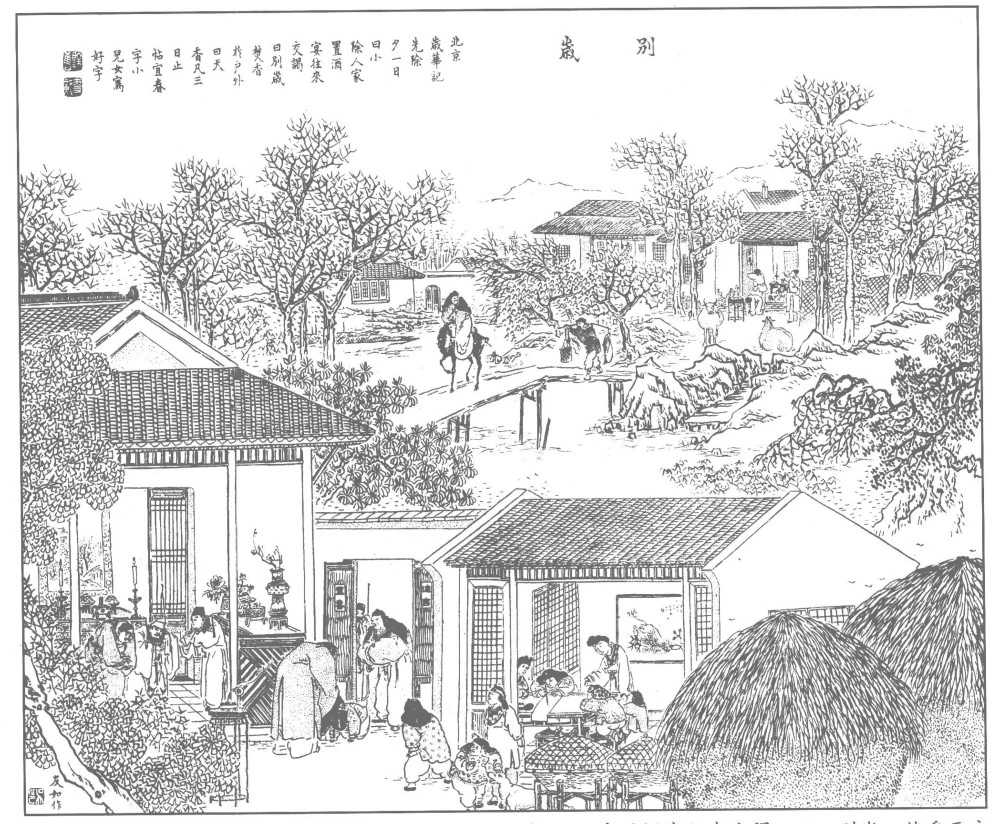 晚清时期在上海刊印的《点石斋画报》刊登了以《别岁》为题的画作,画中描绘了贴宜春字、写楹联、互相拜谒的场景。