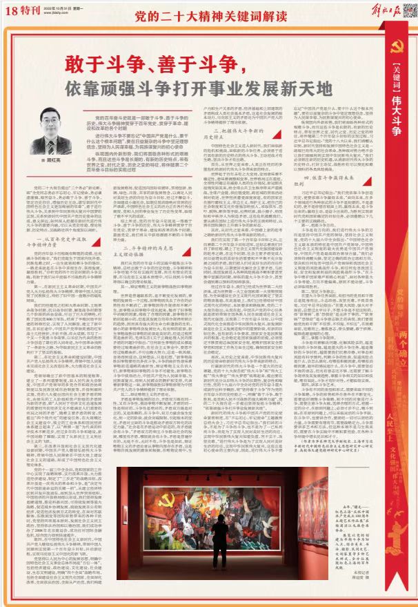 打赢新时代的伟大斗争是一个重大的历史课题。党的十九大报告把“伟大斗争”和“伟大工程”“伟大事业”“伟大梦想”统筹起来,提出要在新时代充分认识伟大斗争的长期性、复杂性和艰巨性。党的十九届六中全会对党的百年奋斗重大成就作出科学概括,将“坚持敢于斗争”作为党的百年奋斗的历史经验之一,明确“敢于斗争、敢于胜利,是党和人民不可战胜的强大精神力量”。党的二十大报告进一步提出坚持发扬斗争精神,“依靠顽强斗争打开事业发展新天地”。