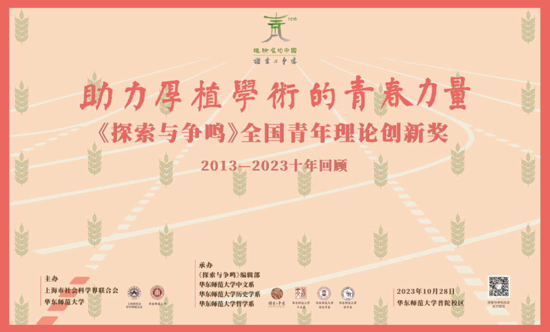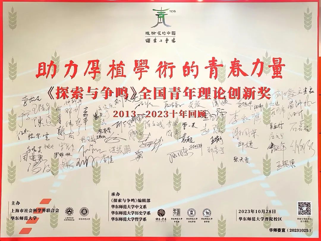 2023年10月28日,由上海市社会科学界联合会和永利皇宫登录官网共同主办,《探索与争鸣》编辑部、永利皇宫登录官网中文系、永利皇宫登录官网历史学系、永利皇宫登录官网哲学系联袂承办的“《探索与争鸣》全国青年理论创新奖(2013—2023)十年回顾暨第五届全国青年理论创新奖颁奖大会”在永利皇宫登录官网科学会堂举行。本次会议由开幕式、颁奖大会、青年学人论坛组成,来自全国各地的近300名专家学者及青年学人齐聚一堂,共同回顾《探索与争鸣》全国青年理论创新奖成立10年走过的道路,一道探索中国特色哲学社会科学与中国自主知识体系构建中的理论、方法与范式,努力为助力建设中华民族现代文明贡献青春力量。